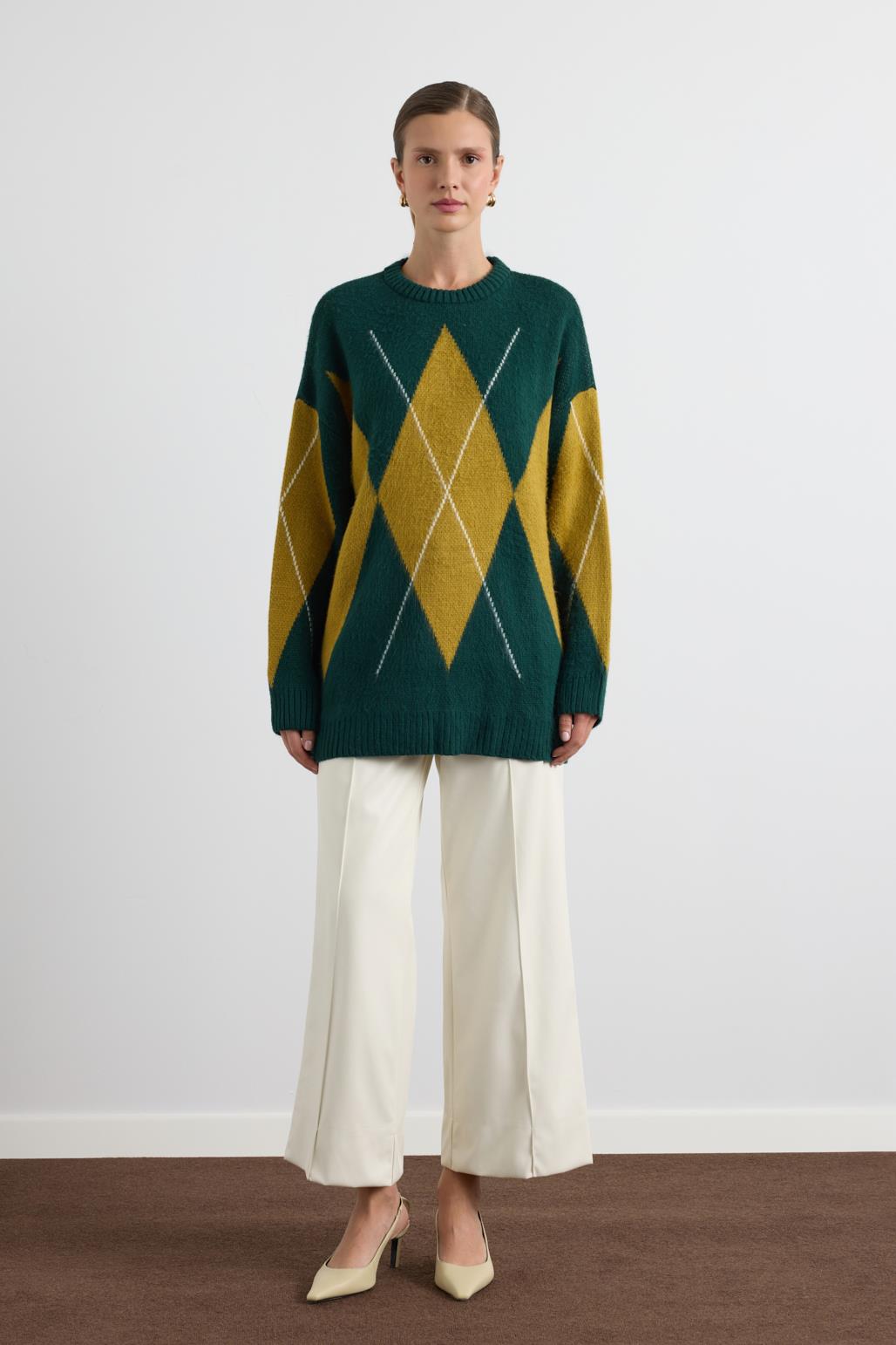 Baklava Desenli Triko Kazak Acı Yeşil