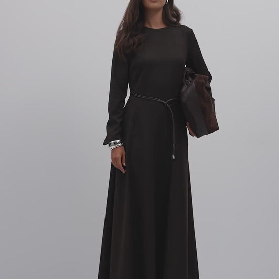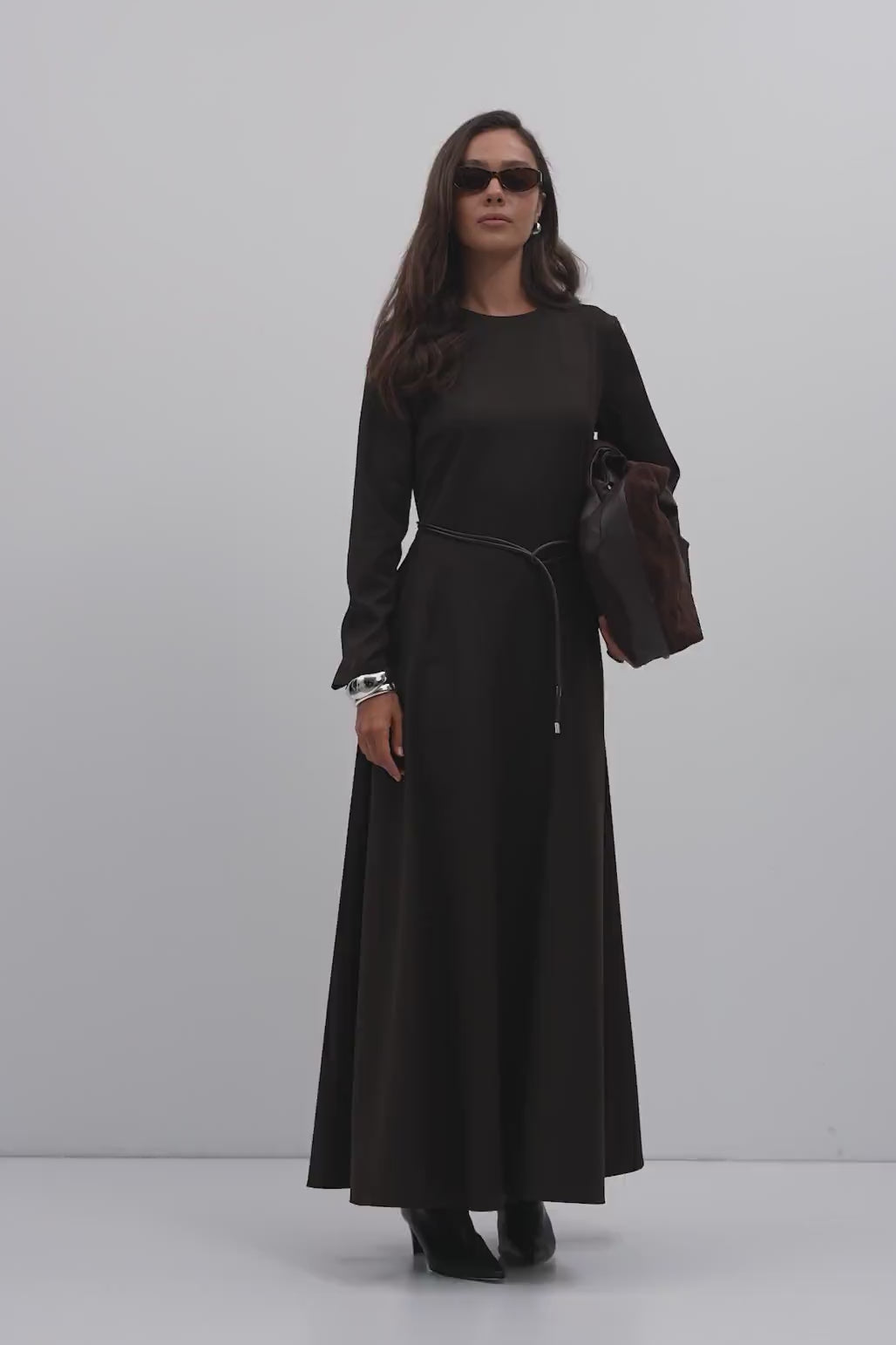 Bisiklet Yaka Parçalı Uzun Elbise Kahve