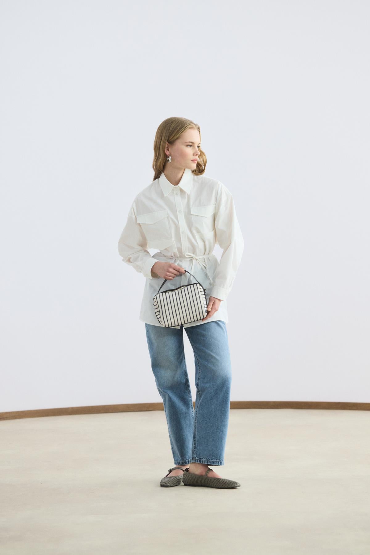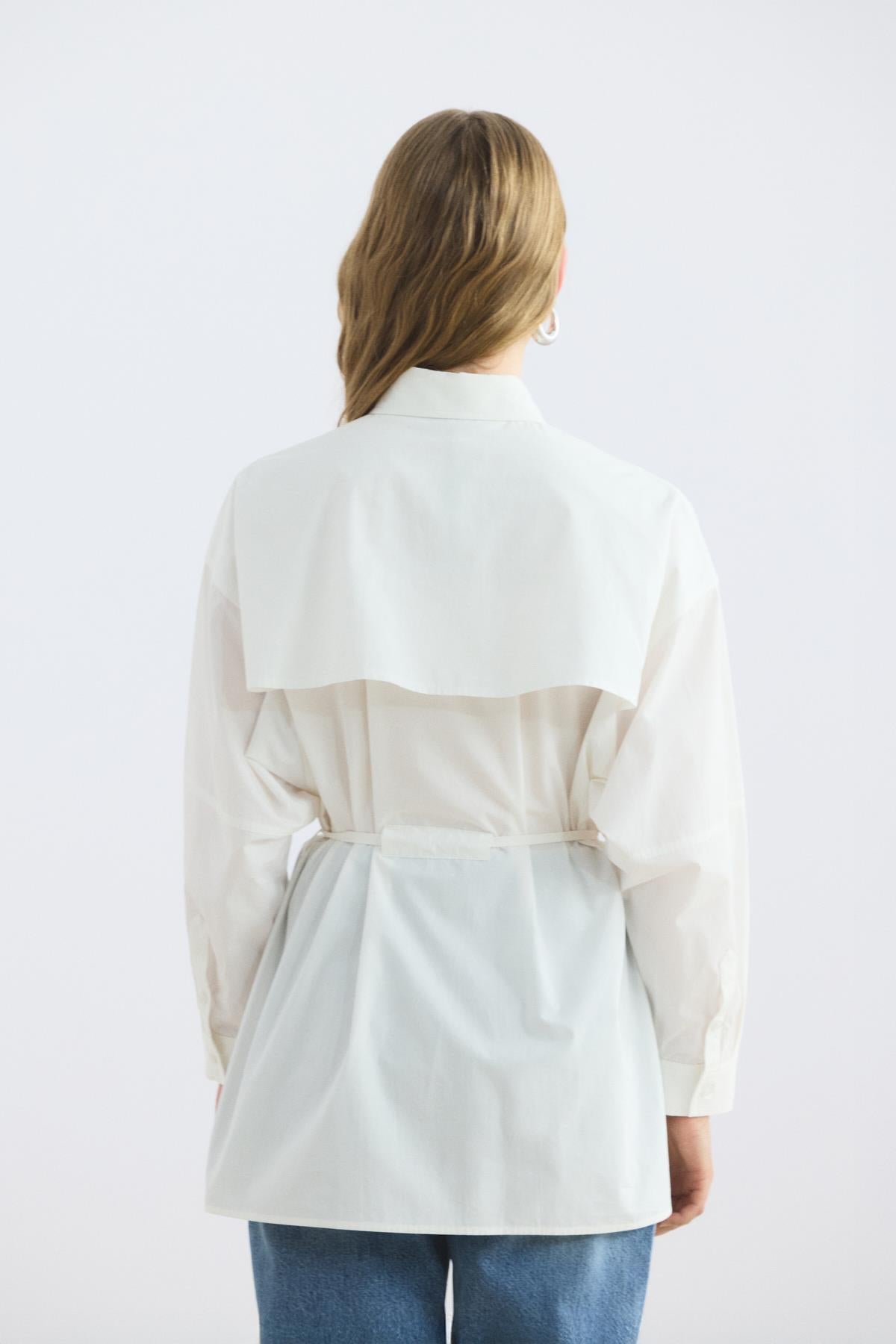 Cepli Biye Kemerli Oversize Gömlek Ekru