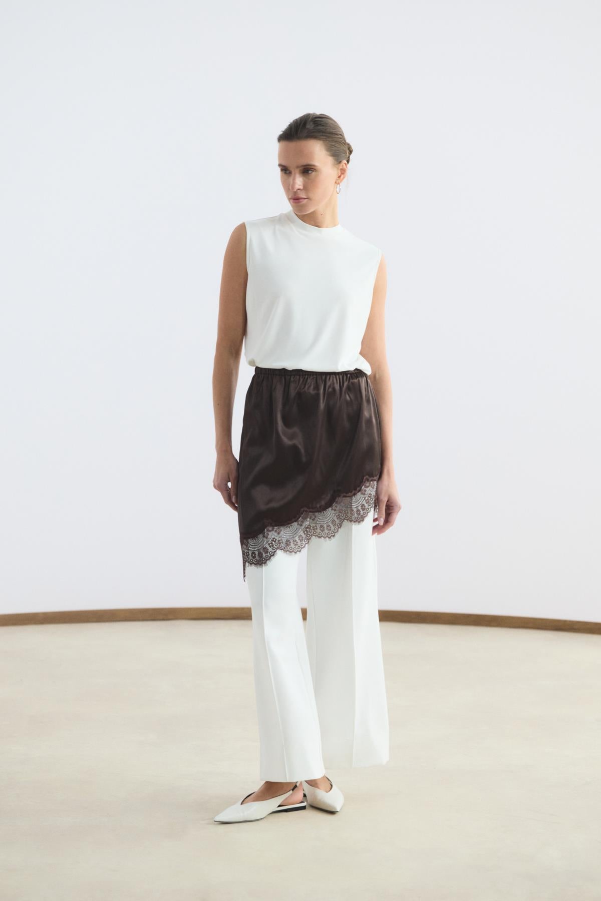 Dantel Şeritli Etek Kahverengi, saten kumaşın akıcı ve pürüzsüz dokusuyla konforlu bir kullanım sağlar. Beli lastikli yapısı sayesinde rahatça giyilir ve bedene uyumlu bir kullanım sunar. Asimetrik formu modern bir  görünüm kazandırırken, etek ucundaki dantel şerit detayı ürüne zarif ve feminen görünüm kazandırır.
