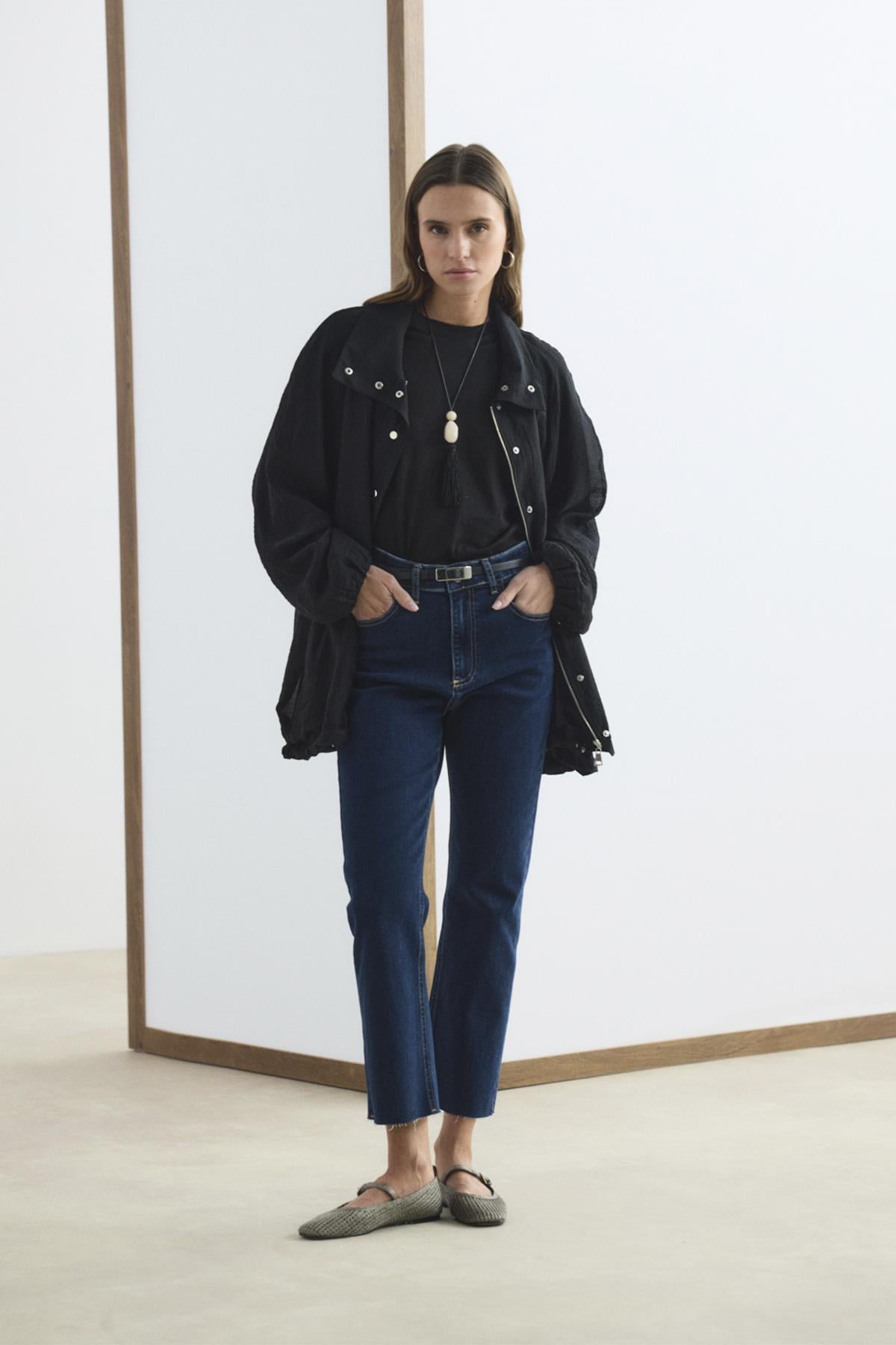 Dik Yaka Büzgülü Bomber Ceket Siyah, viskon karışımlı teknik kumaşının pürüzsüz dokusuyla üstünüzde hafif bir his bırakır. Dik yaka tasarımı, reglan balon kolları ve aşağıya doğru genişleyen evaze formu, alışılmış ceket tasarımlarına modern bir yorum katar. Çıtçıtlı kapaması, gizli metal fermuarı ve iç astarı ile kullanım kalitesini artırırken, yan cepleriyle günlük pratiklik sunar.