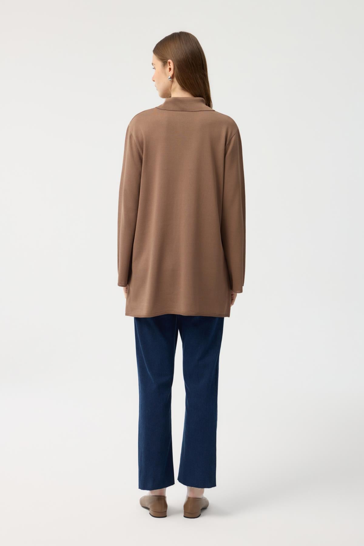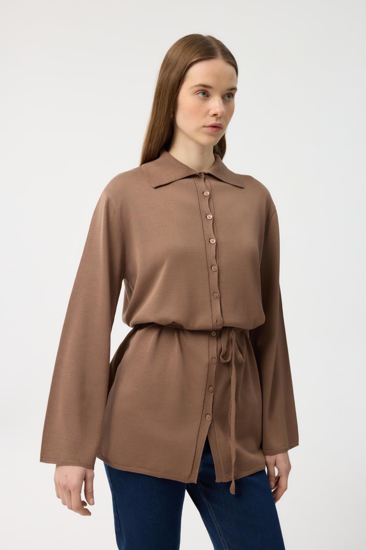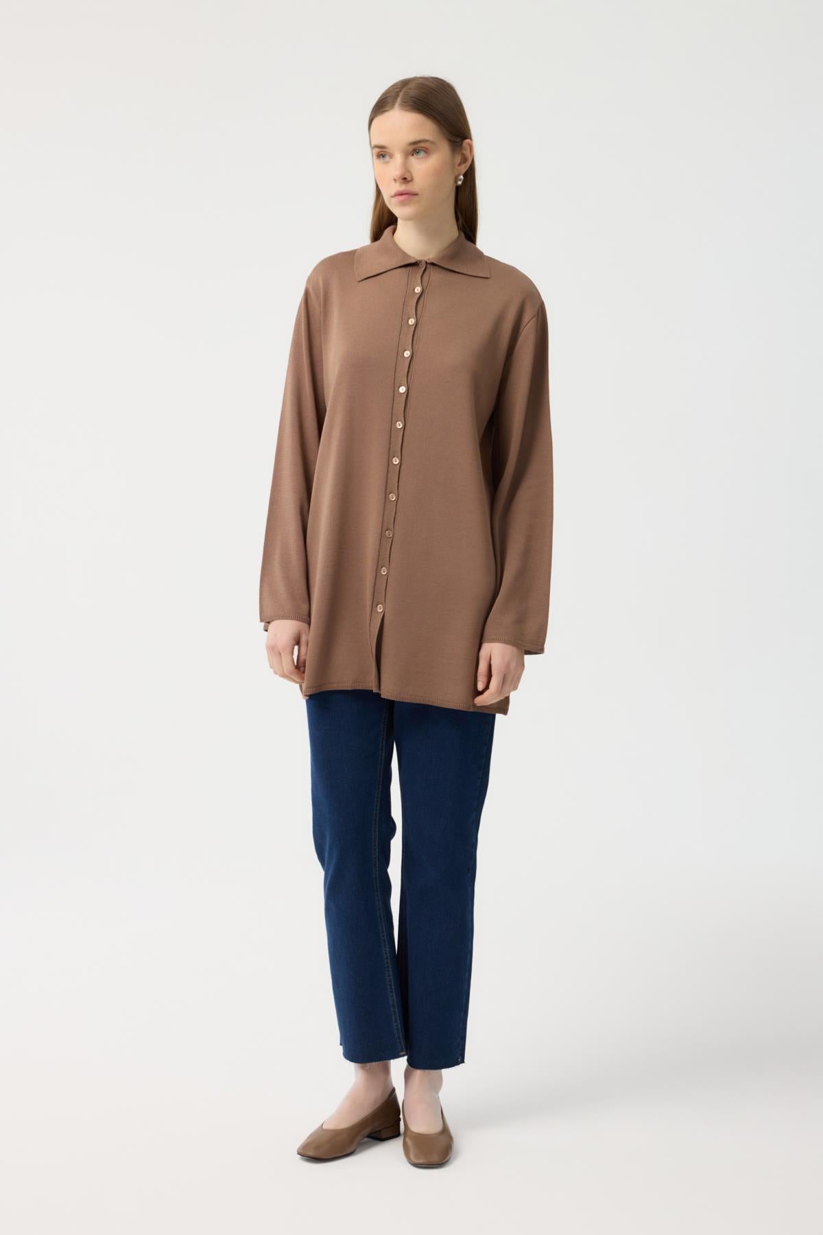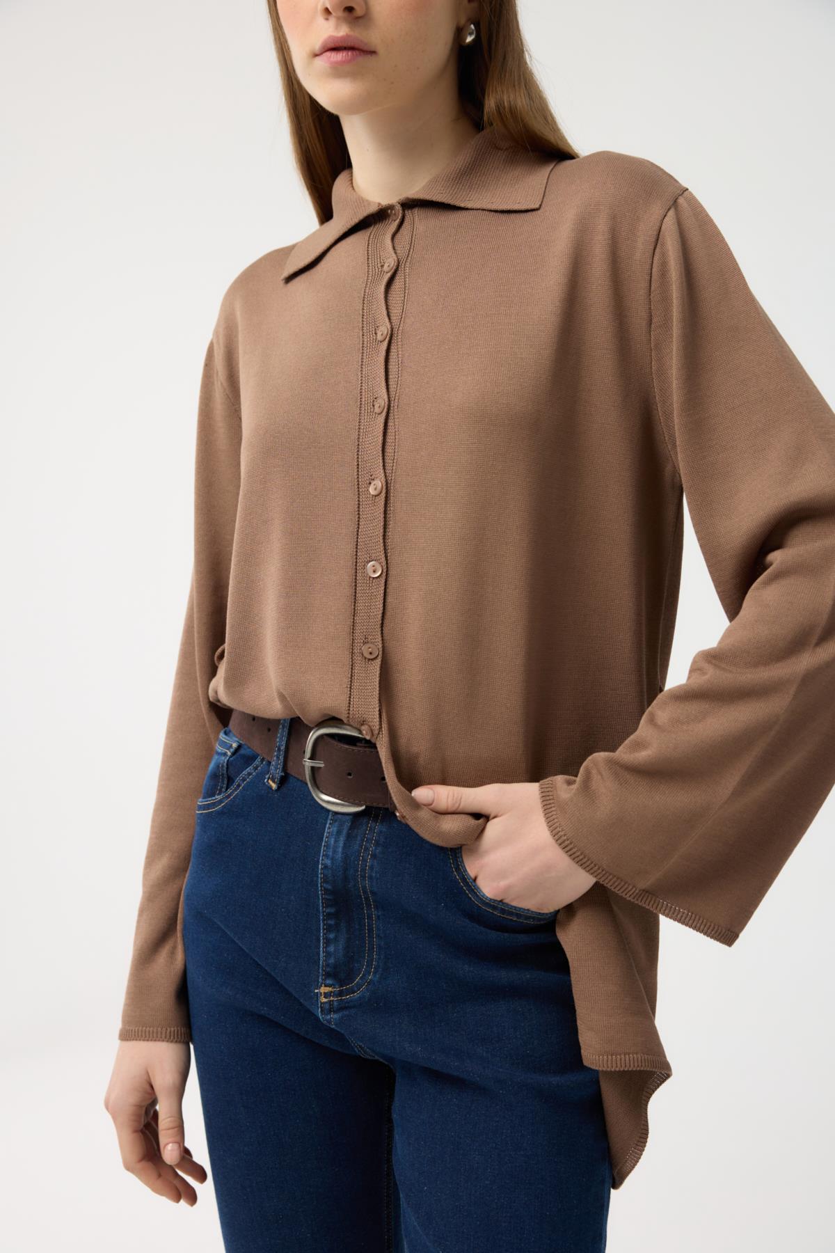 Düğmeli İnce Triko Hırka Toprak, viskon karışımlı trikonun ipeksi dokusu ve hafif yapısıyla üzerinizde zarif bir görünüm sergiler. Klasik yaka tasarımıyla zamansız bir duruş sunan triko hırka, yarasa kol kesimi sayesinde modern ve özgür bir silüet çizer. Seyyar biye kemeri, tunik boydaki hırkayı tercihinize göre bel hattını vurgulayan şık bir forma kavuşturur.