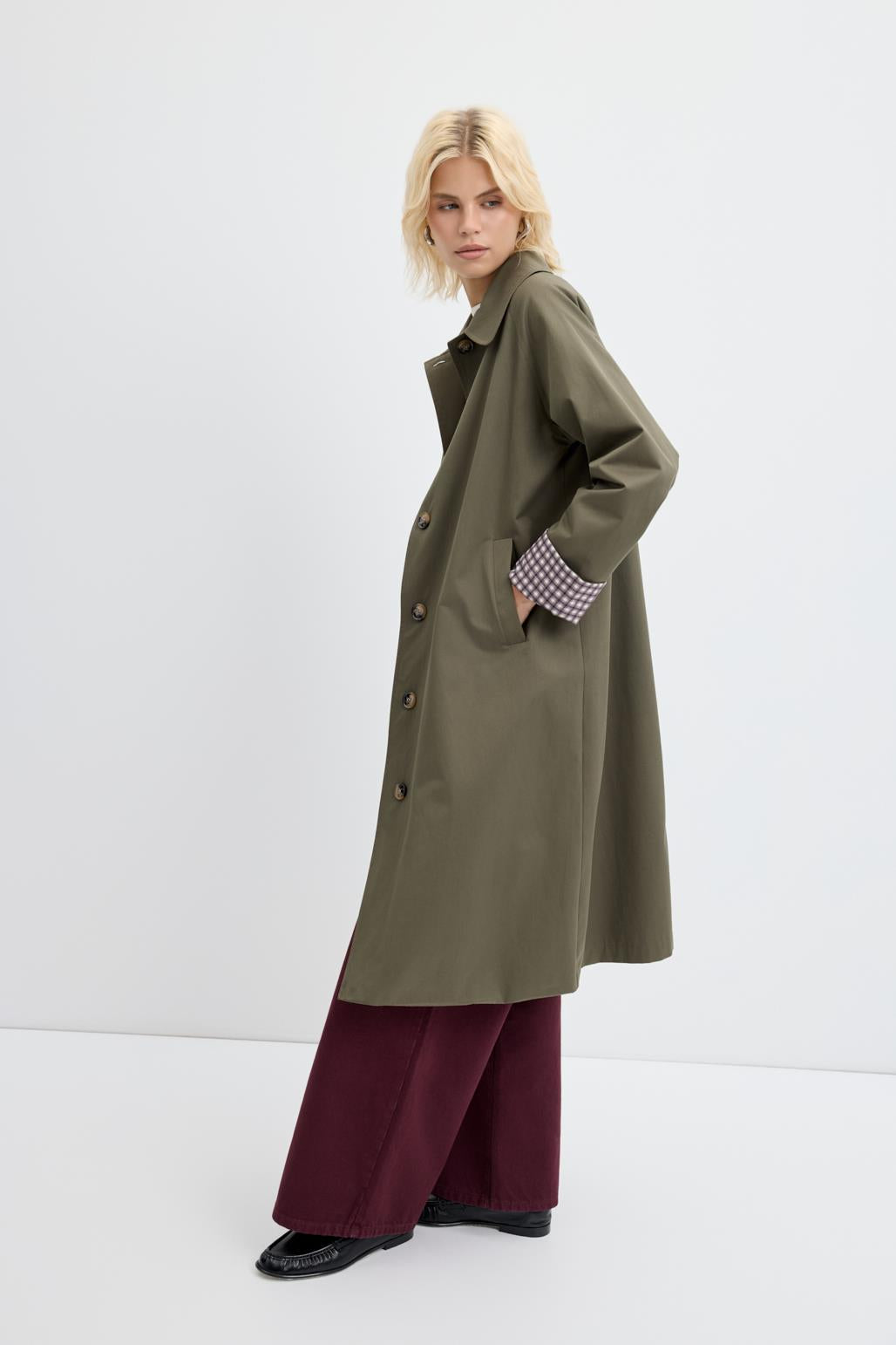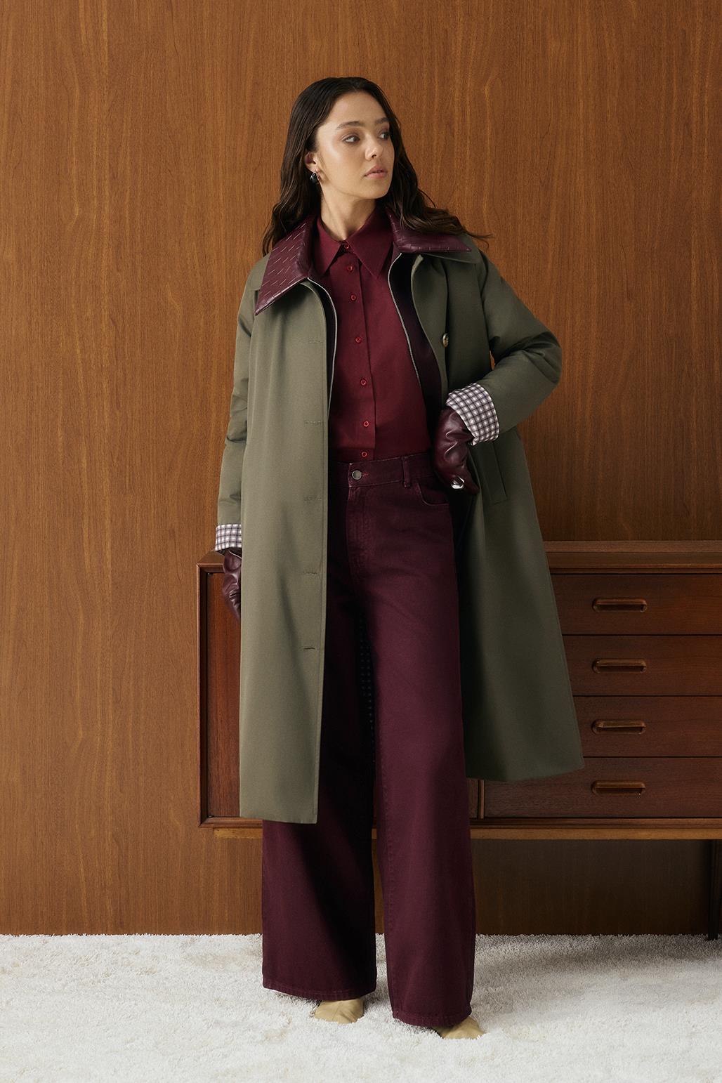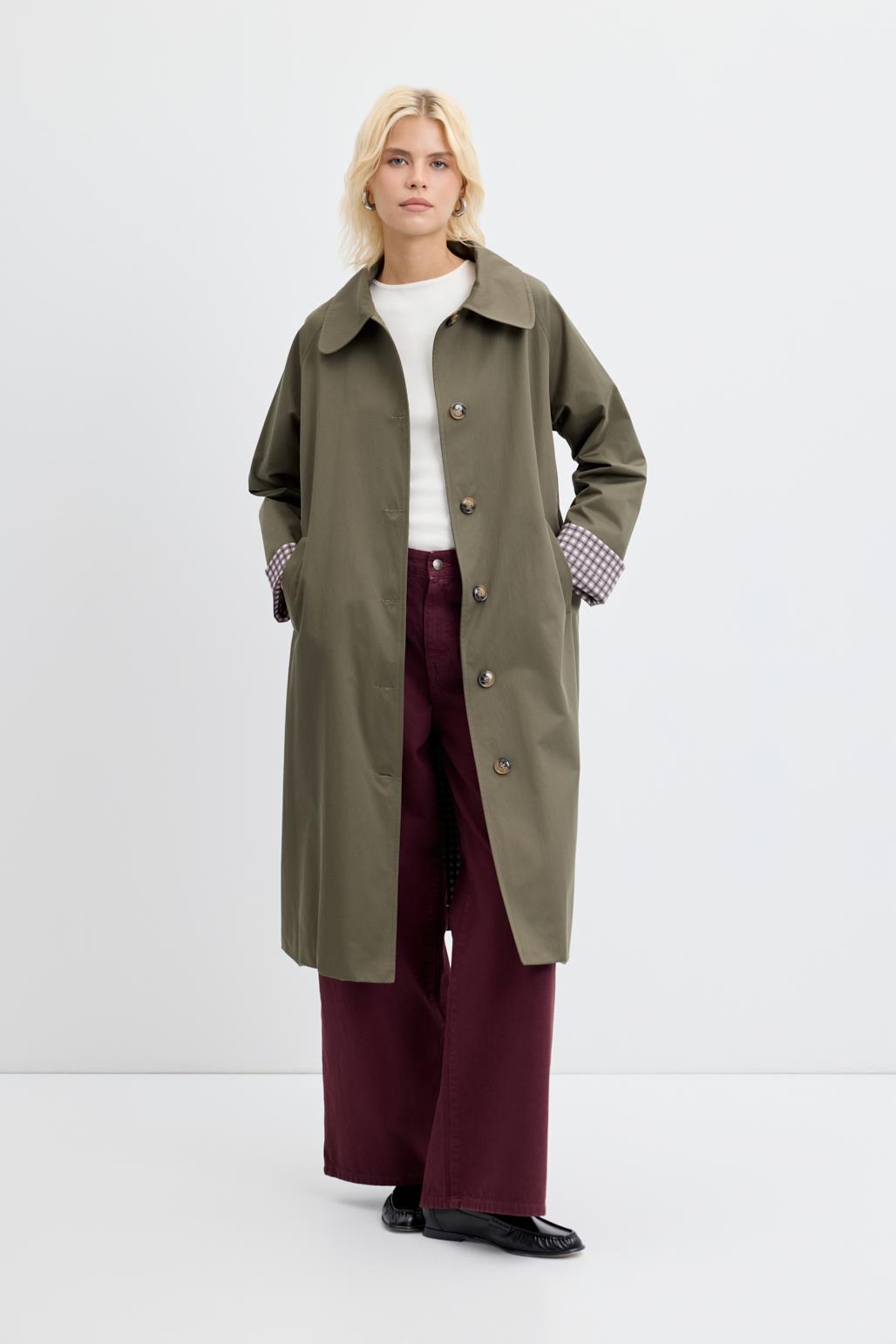 Ekose Astarlı Oversize Uzun Trençkot Haki, pamuk karışımlı gabardin kumaştan üretilmiştir. Geniş yakası ve uyumlu desenli astarıyla hem estetik bir görünüm hem de konfor sunar. Arka etek ucundaki yırtmaç detayı hareket özgürlüğü sağlarken, katlanabilir kol uçları pratik kullanım imkânı verir. Düğmeli kapama ve seyyar kuşak ile belinizi dilediğiniz gibi şekillendirebilirsiniz. Oversize ve rahat kesimiyle günlük kombinlere kolaylıkla uyum sağlar.