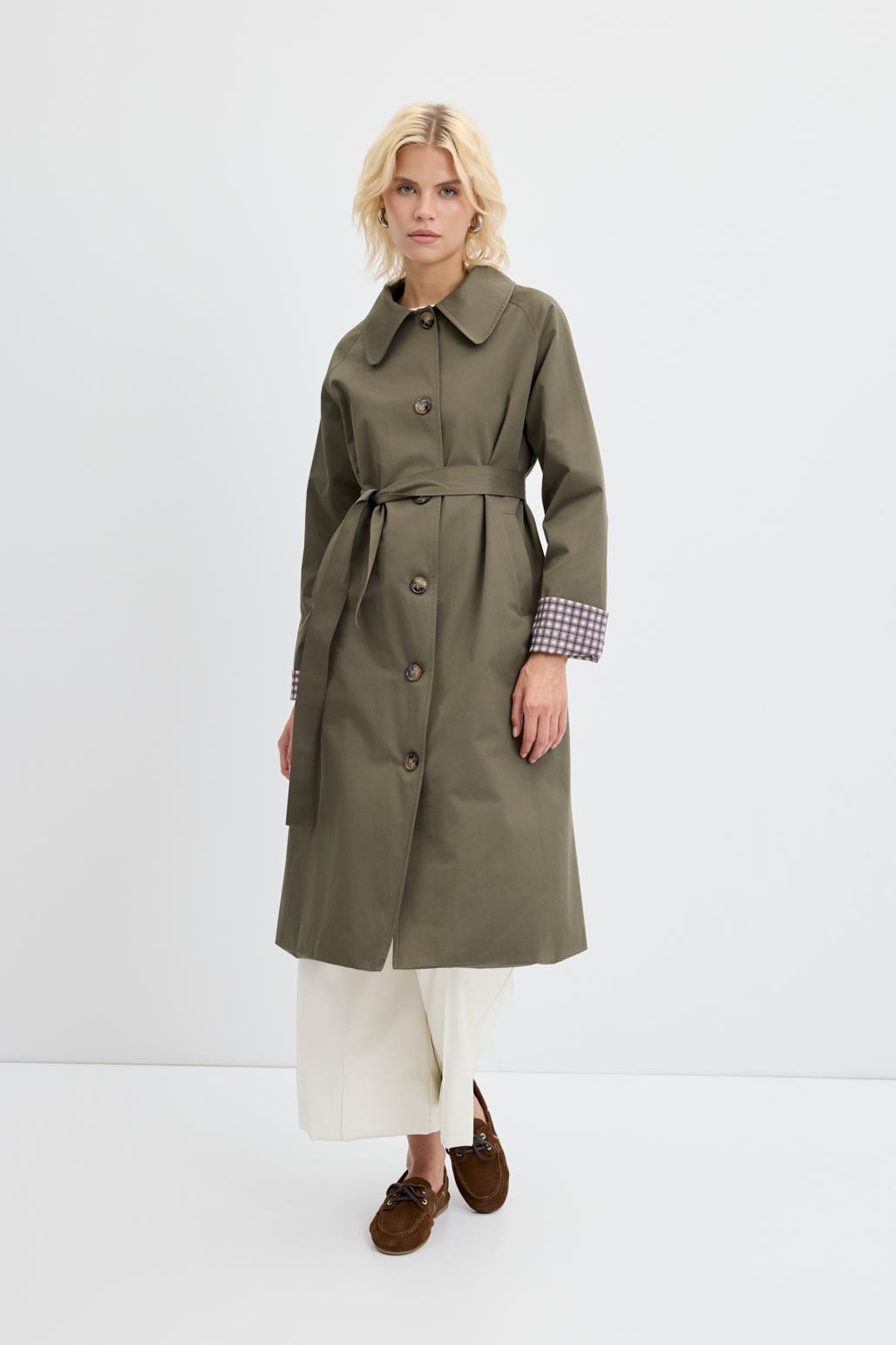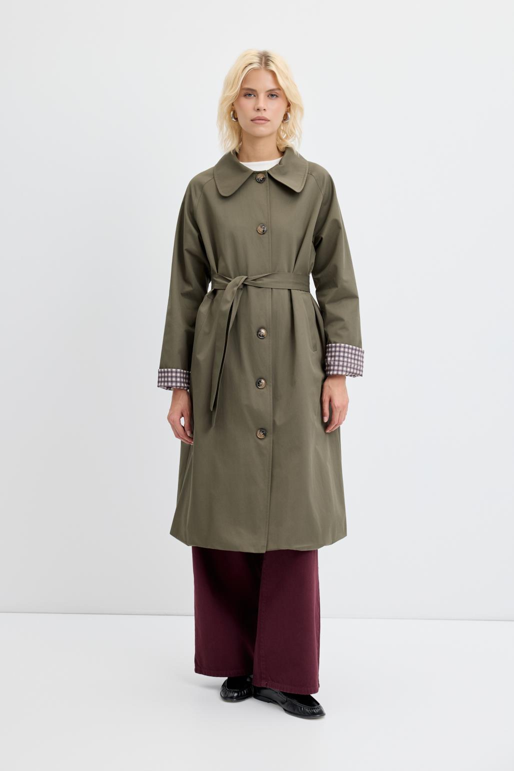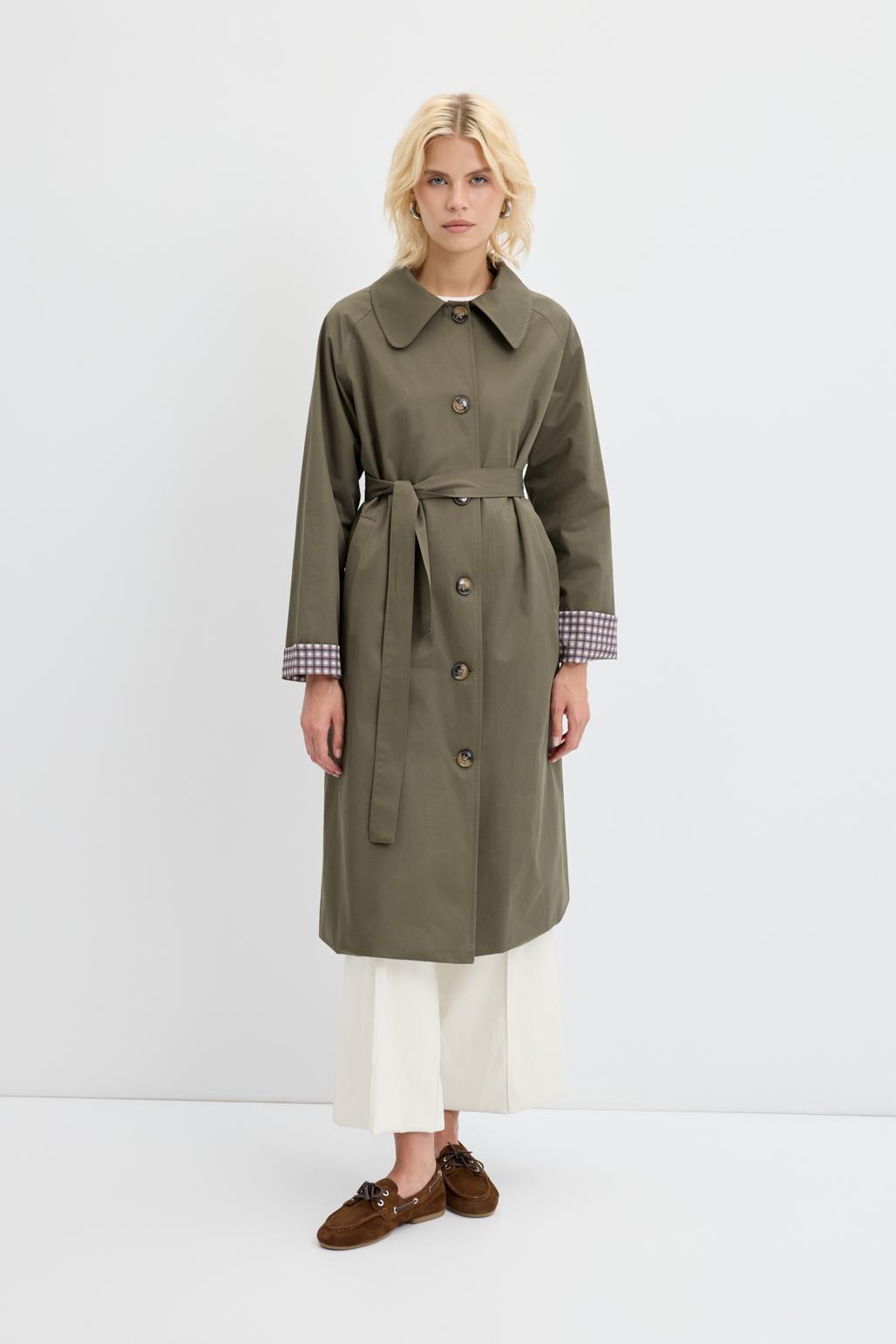 Ekose Astarlı Kemerli Uzun Trençkot Haki