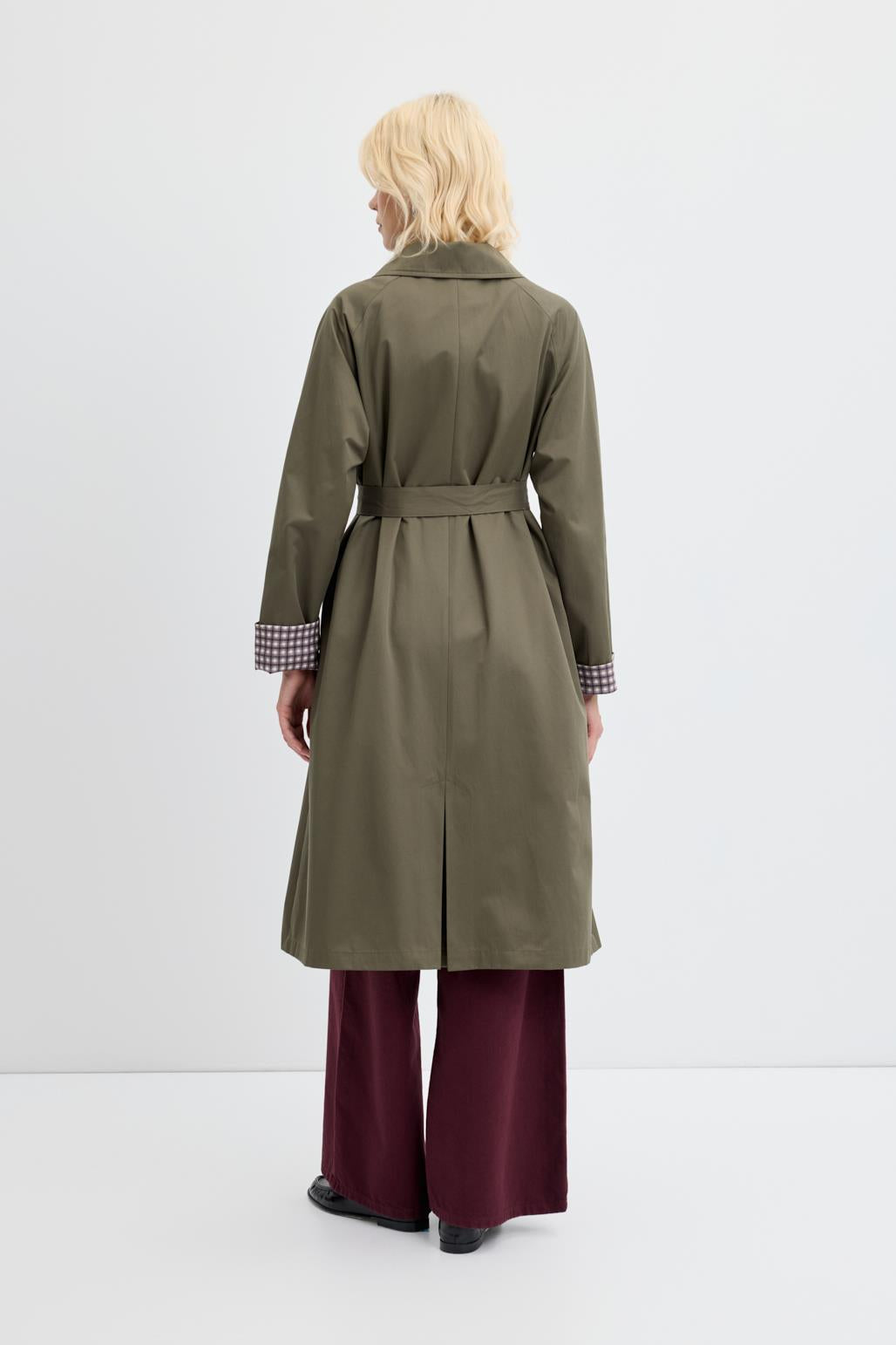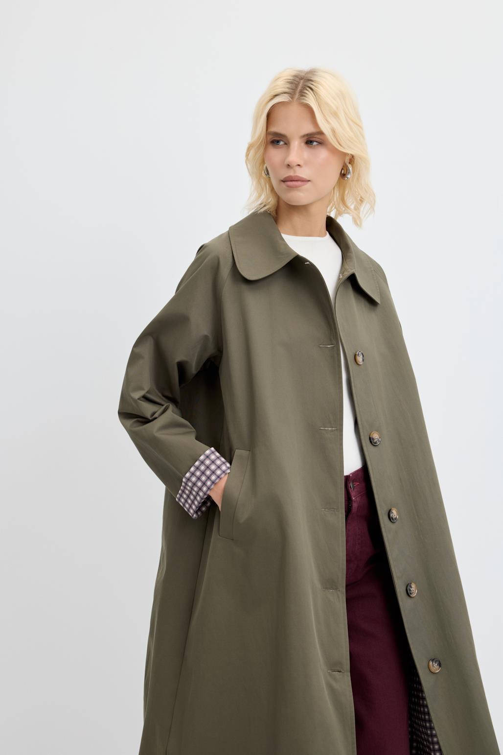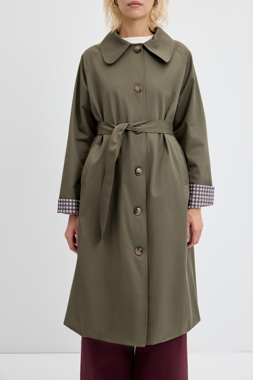 Ekose Astarlı Kemerli Uzun Trençkot Haki