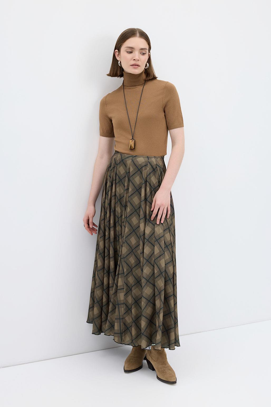 Ekose Desenli Uzun Kloş Etek Kahve
