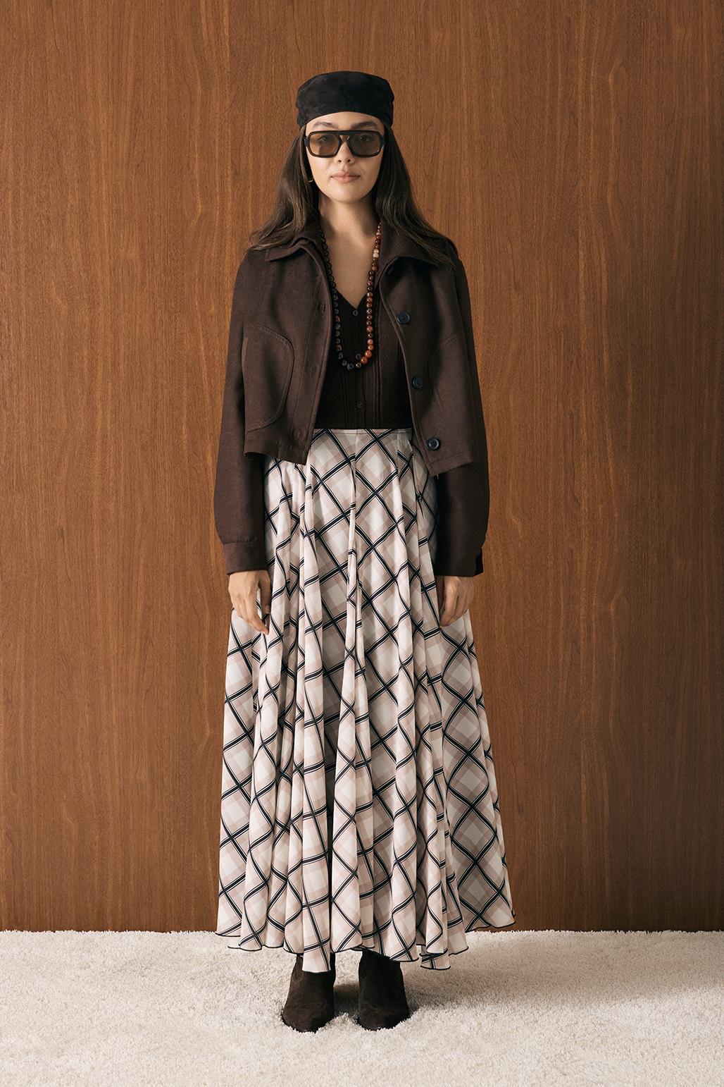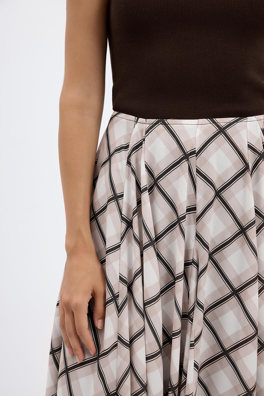 Ekose Desenli Uzun Kloş Etek Vizon, desenli dokulu şifon kumaşı ve kırışık yüzeyiyle hafif ve hareketli bir duruş sunar. Yüksek bel kesimi ve parça detaylı kloş formu eteğe zarif bir siluet kazandırırken, astarlı yapısı konforlu kullanım sağlar. Yandan gizli fermuar kapaması temiz bir görünüm sunar. Günlük ve özenli kombinlerde rahatlıkla tercih edilebilir.