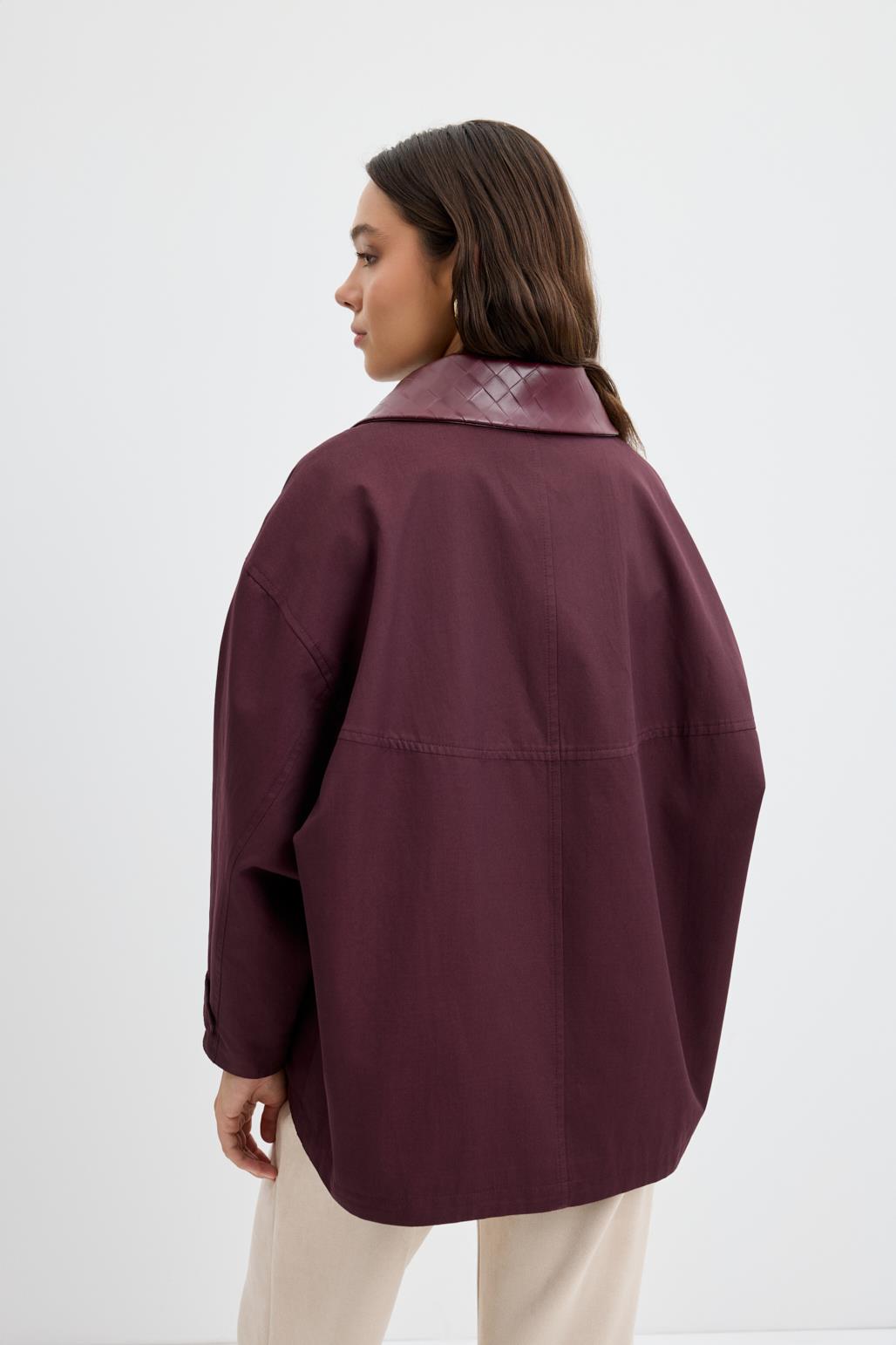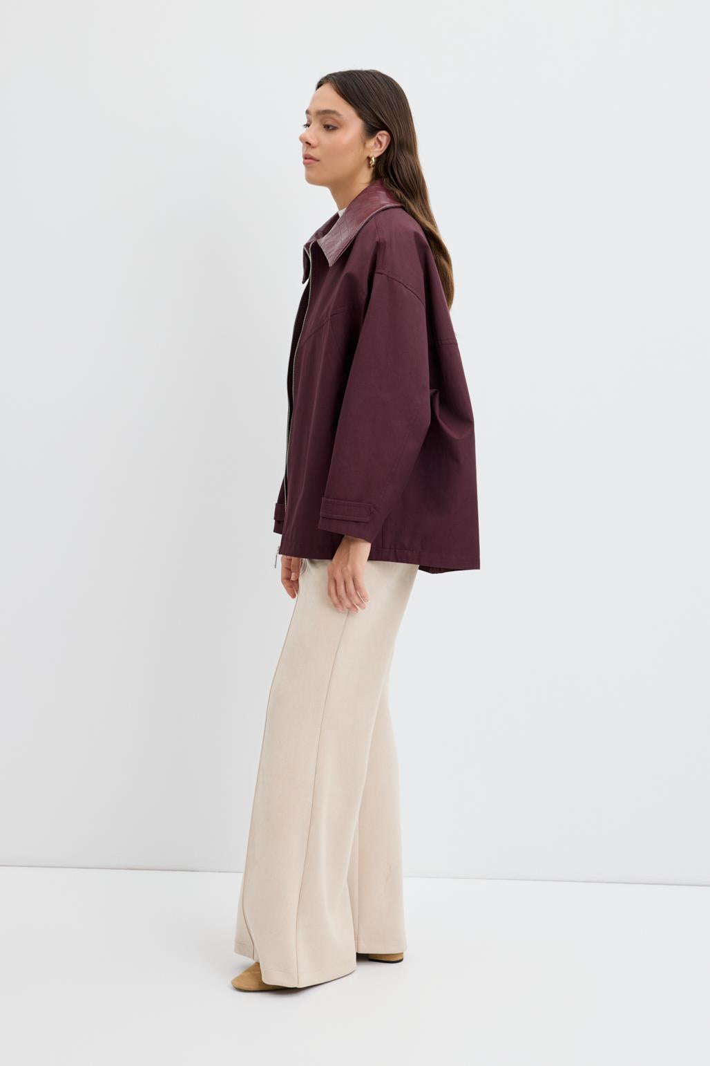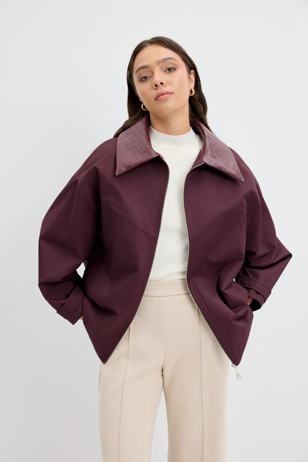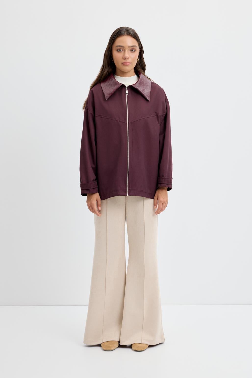 Fermuarlı Deri Yakalı Ceket Mürdüm