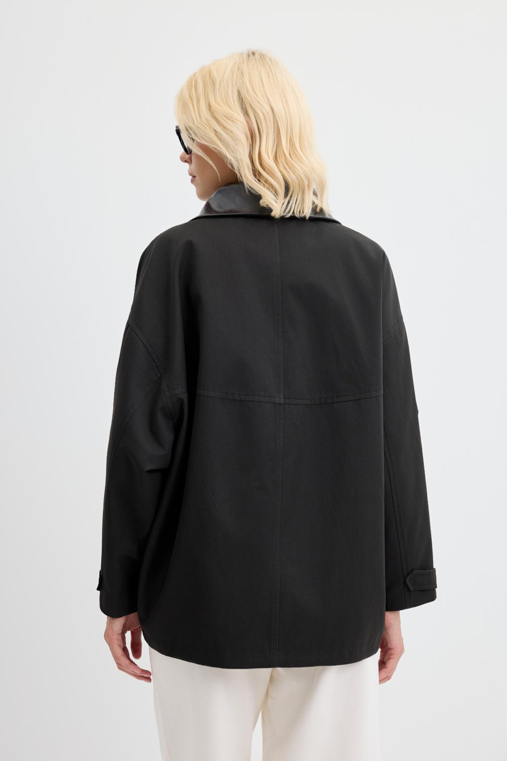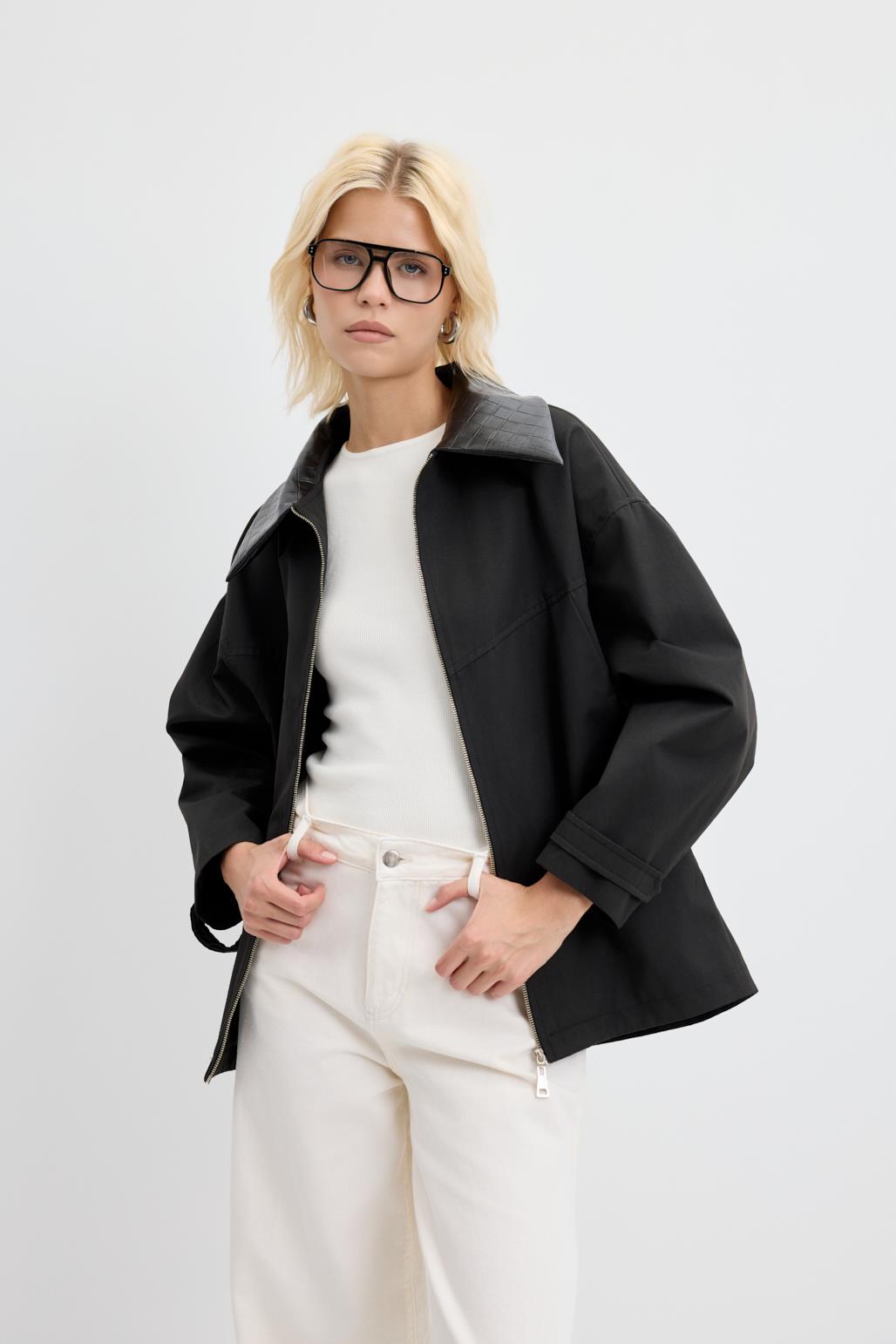 Fermuarlı Deri Yakalı Ceket Siyah, pamuk karışımlı gabardin kumaştan üretilmiş, astarlı ve bomber formda bir dış giyim modelidir. Geniş örgü yaka garnisi ve deri detaylı yakası modern bir görünüm sunarken, kol apoletleri tasarıma sportif bir hava katar. Önden kesikli tasarımı ve fermuarlı kapamasıyla pratik kullanım sağlar. Konforlu ve şık yapısıyla stilinizi tamamlayan zamansız bir seçenektir.
