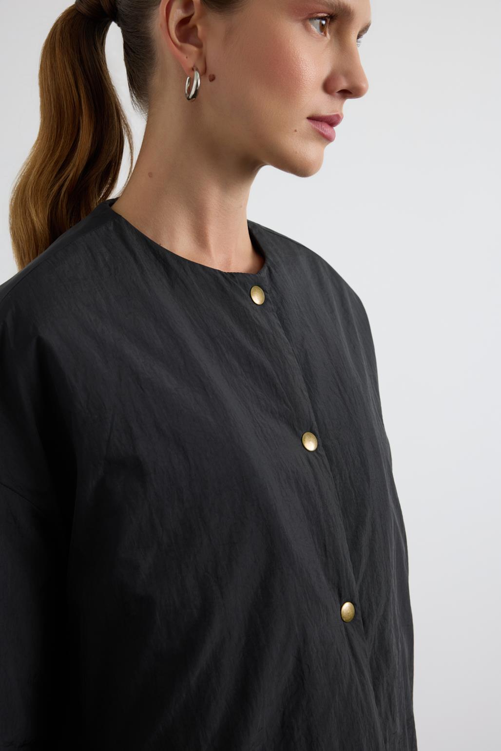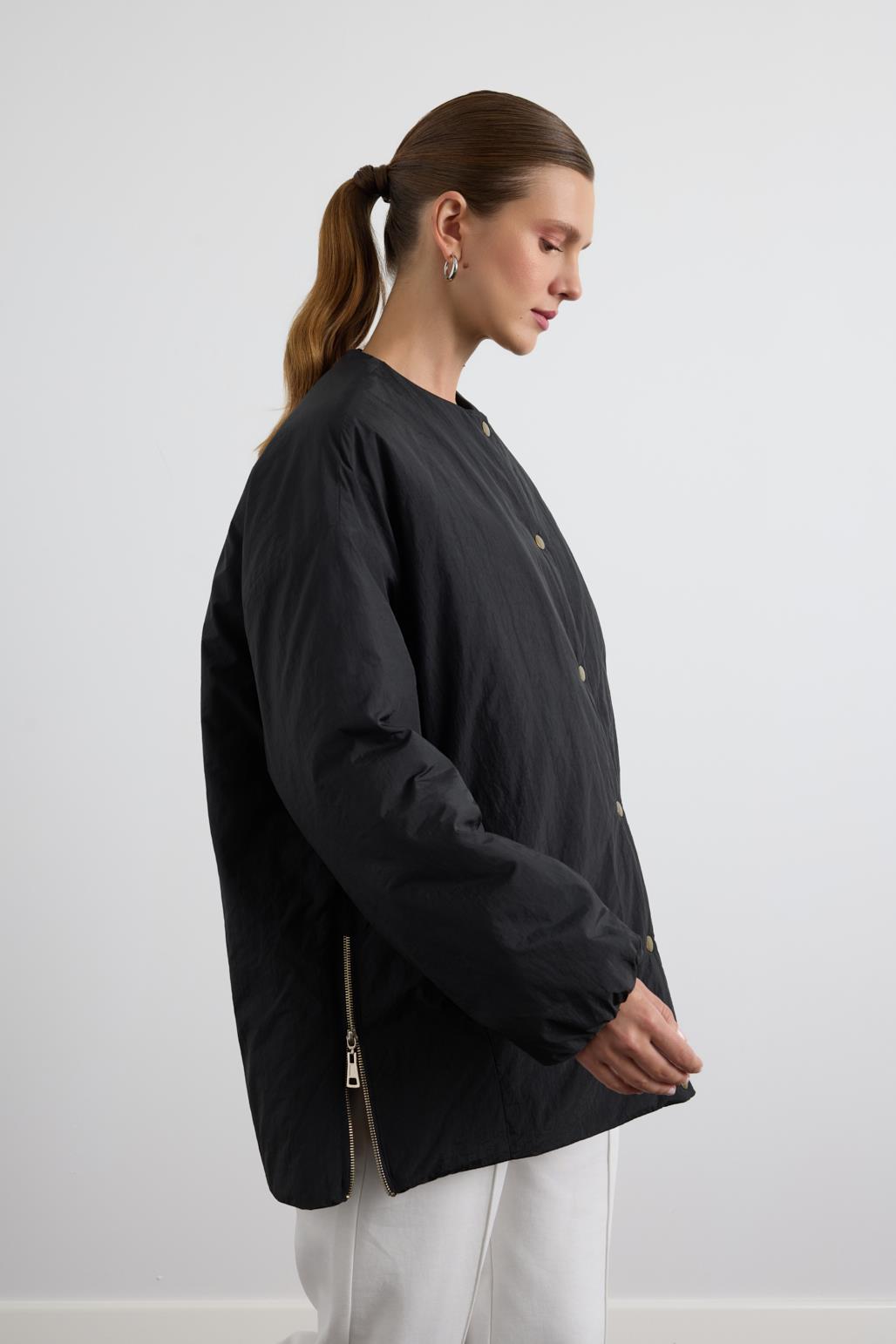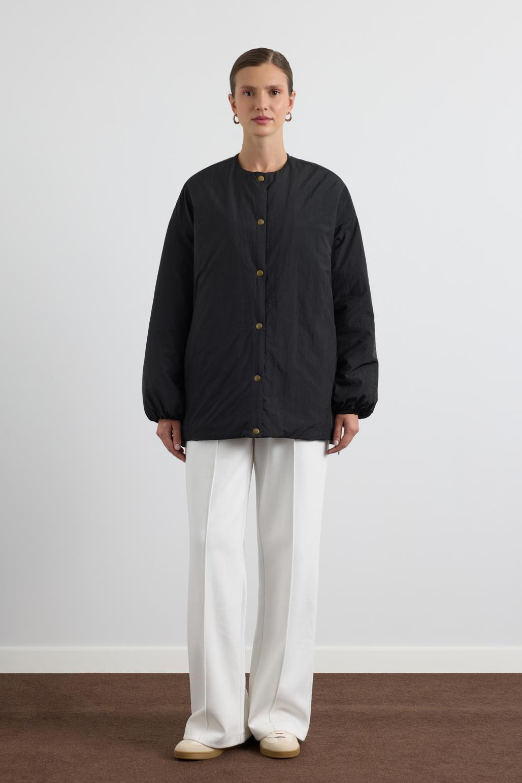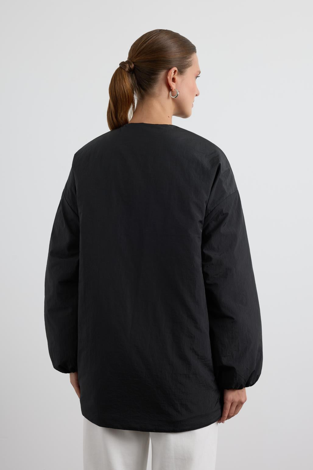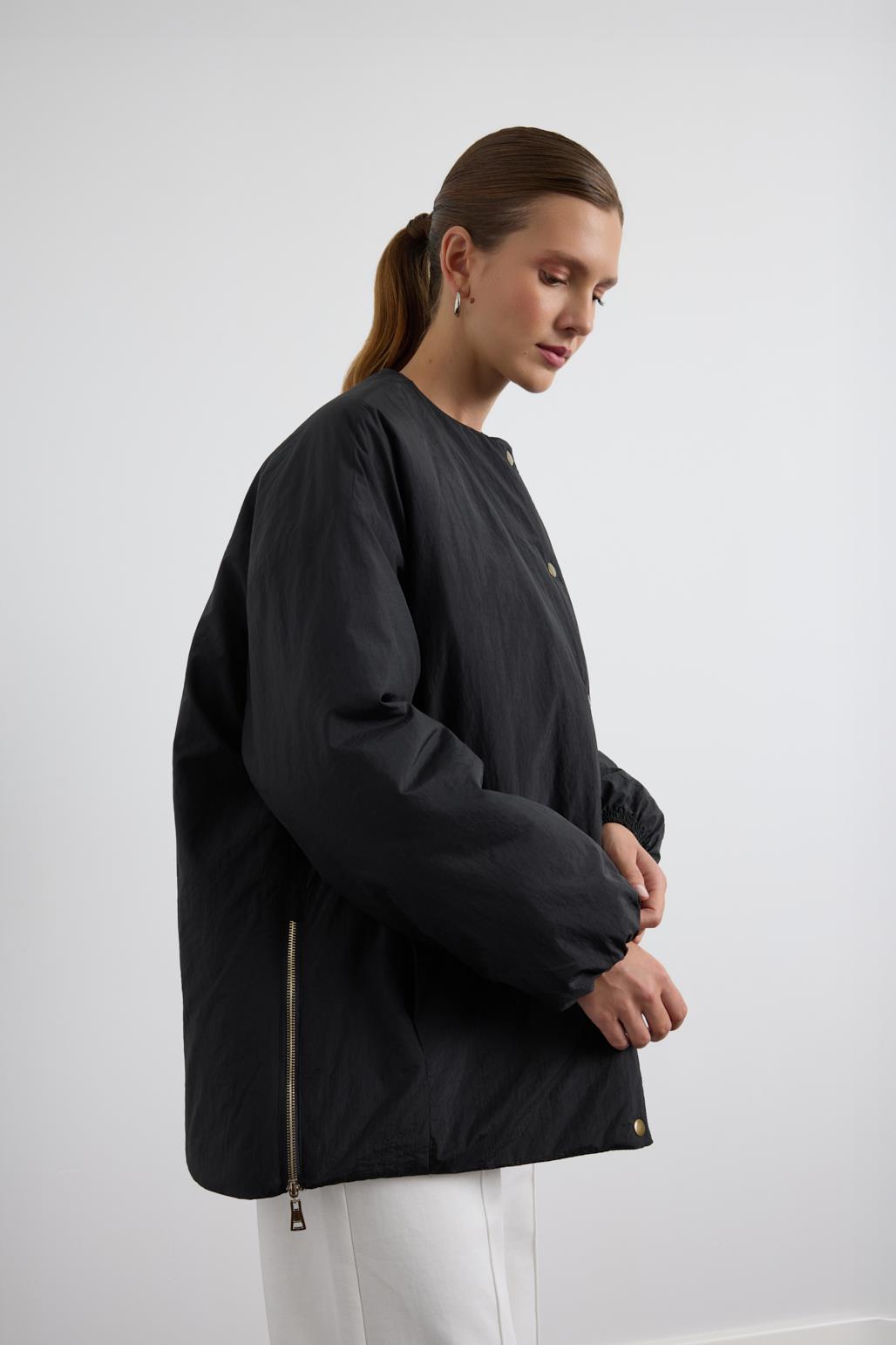 Fermuarlı Şişme Mont Siyah, su itici teknik kumaştan üretilmiş olup, bisiklet yaka tasarımıyla modern bir görünüm sunar. Önü çıtçıt kapamalı olup, yan dikişlerdeki fermuar detayları montun kullanımını kolaylaştırır. Su itici özelliği sayesinde hafif yağışlı havalarda rahatlıkla giyilebilir.