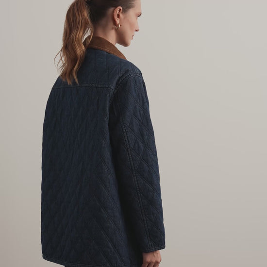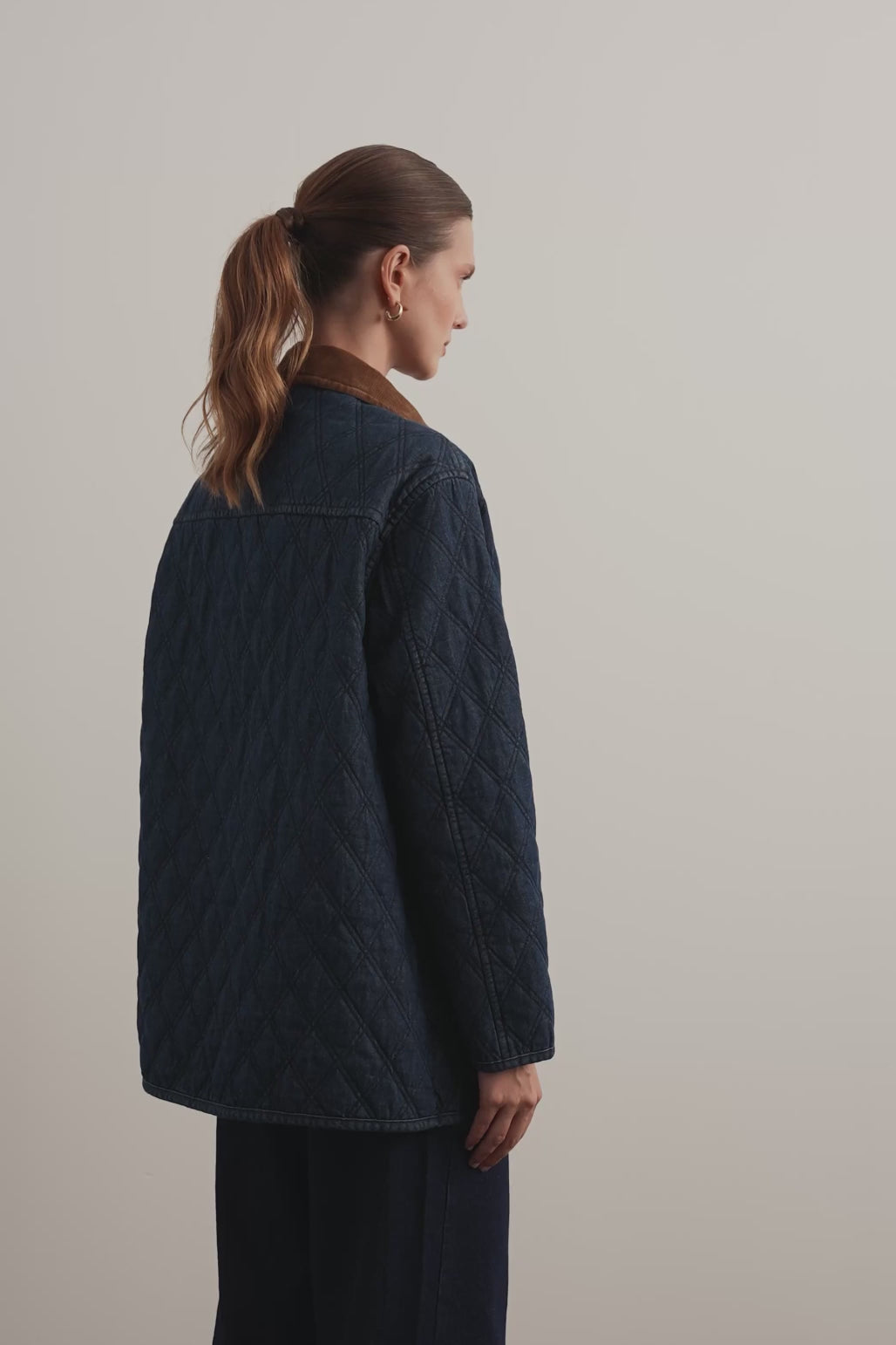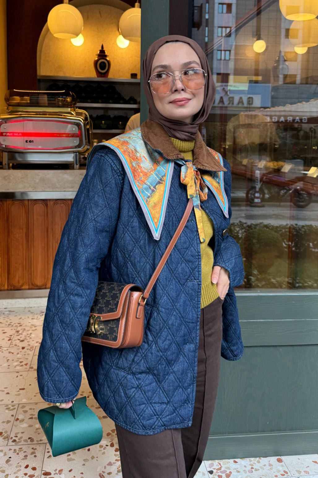 Kadife Yakalı Fileto Cepli Kapitone Ceket Koyu Mavi, %100 pamuk denim kumaşı ve baklava desenli dolgusuyla göz alıcı bir stil sunuyor. Kadife süslemeli yaka ve fileto cepler, şıklığı ve işlevselliği birleştiriyor. Astarlı tasarımı mevsim geçişlerinde konfor ve sıcaklık sağlarken, antik gold düğmeler zarif bir detay katıyor.