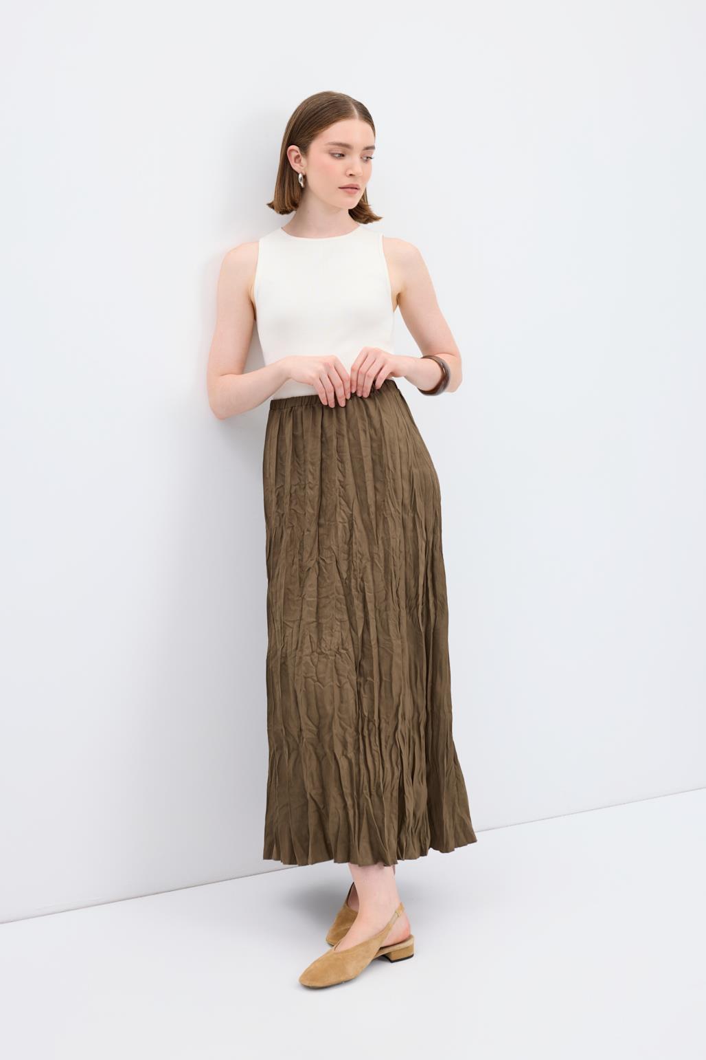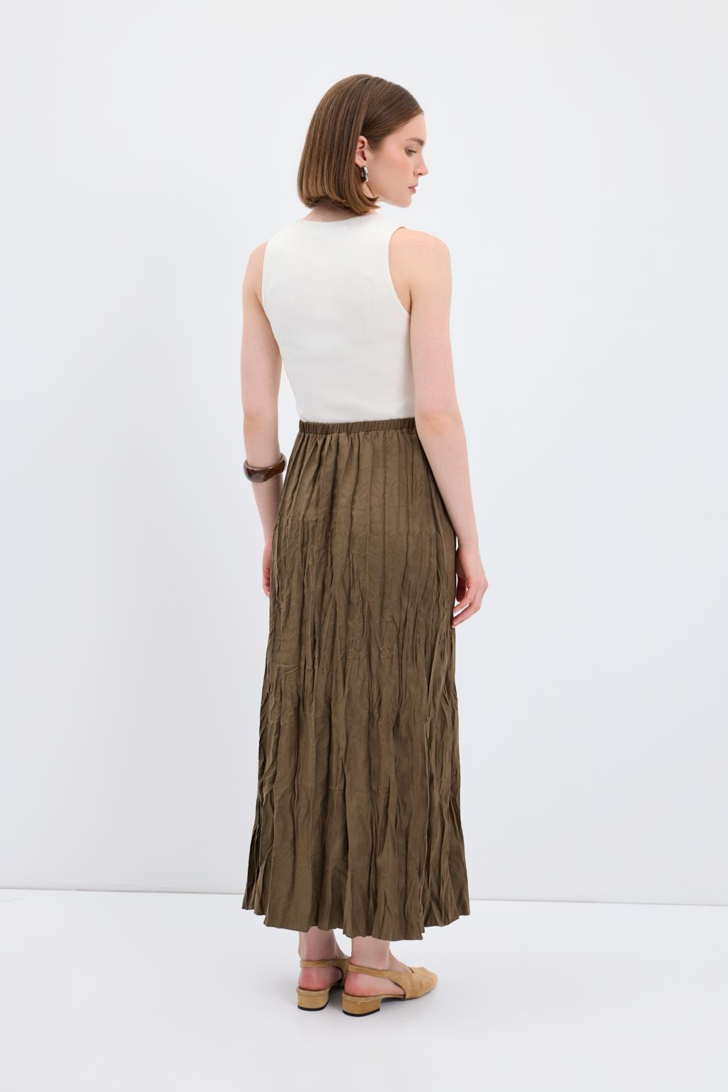 Kırışık Görünümlü Uzun Süet Etek Haki