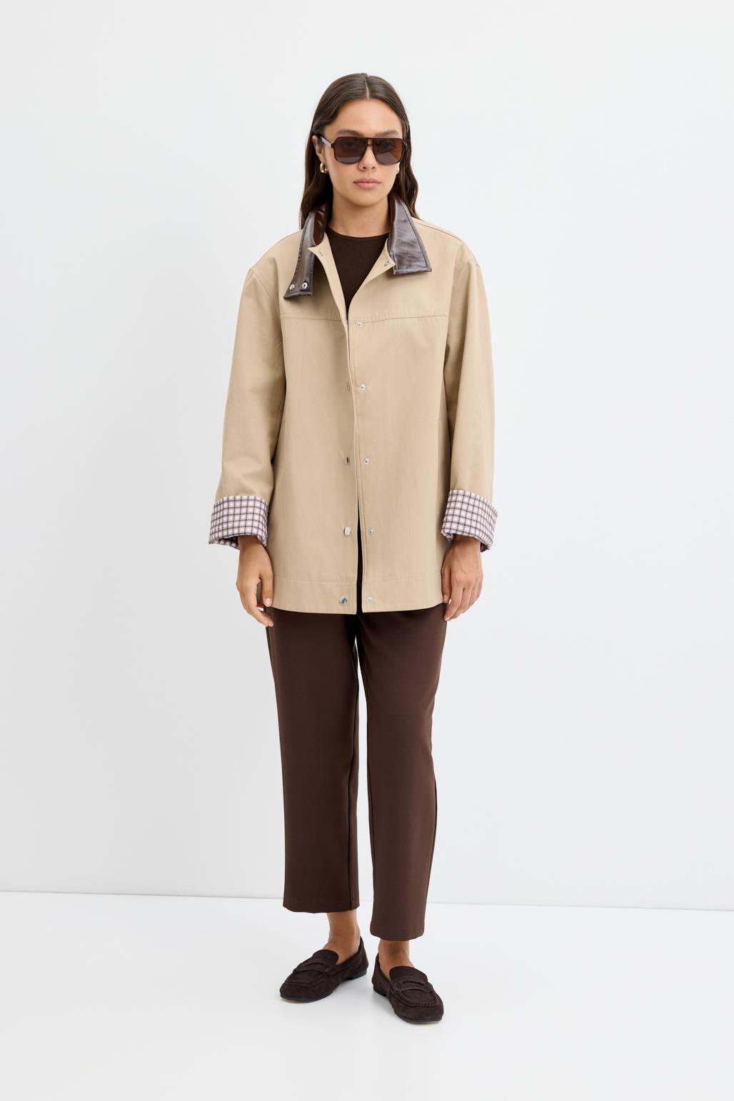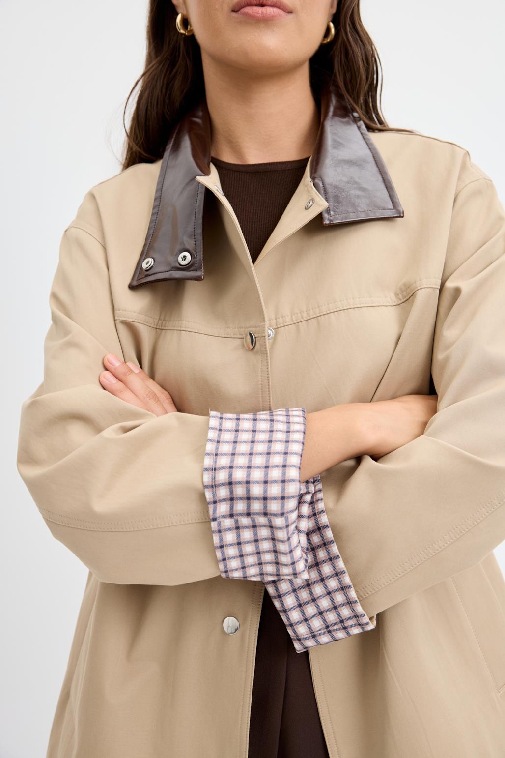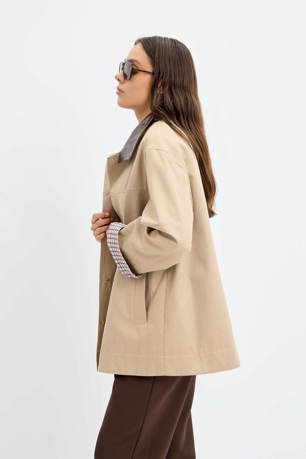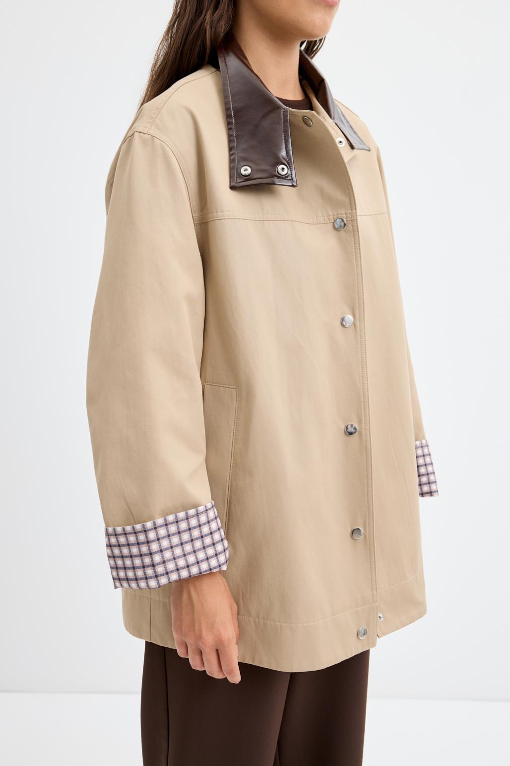 Kontrast Yakalı Ekose Astarlı Ceket Taş, pamuk karışımlı gabardin kumaştan üretilmiş düz kesim bir modeldir. Parlak deri görünümlü yüksek yakası cekete modern ve şık bir dokunuş katarken, uyumlu desenli astarı iç kısmında konfor sağlar. Önden kesikli tasarımı ve katlanabilir kol uçları pratik kullanım sunar. Çıtçıt kapama detayı ise hızlı ve kolay kapanma imkânı verir.