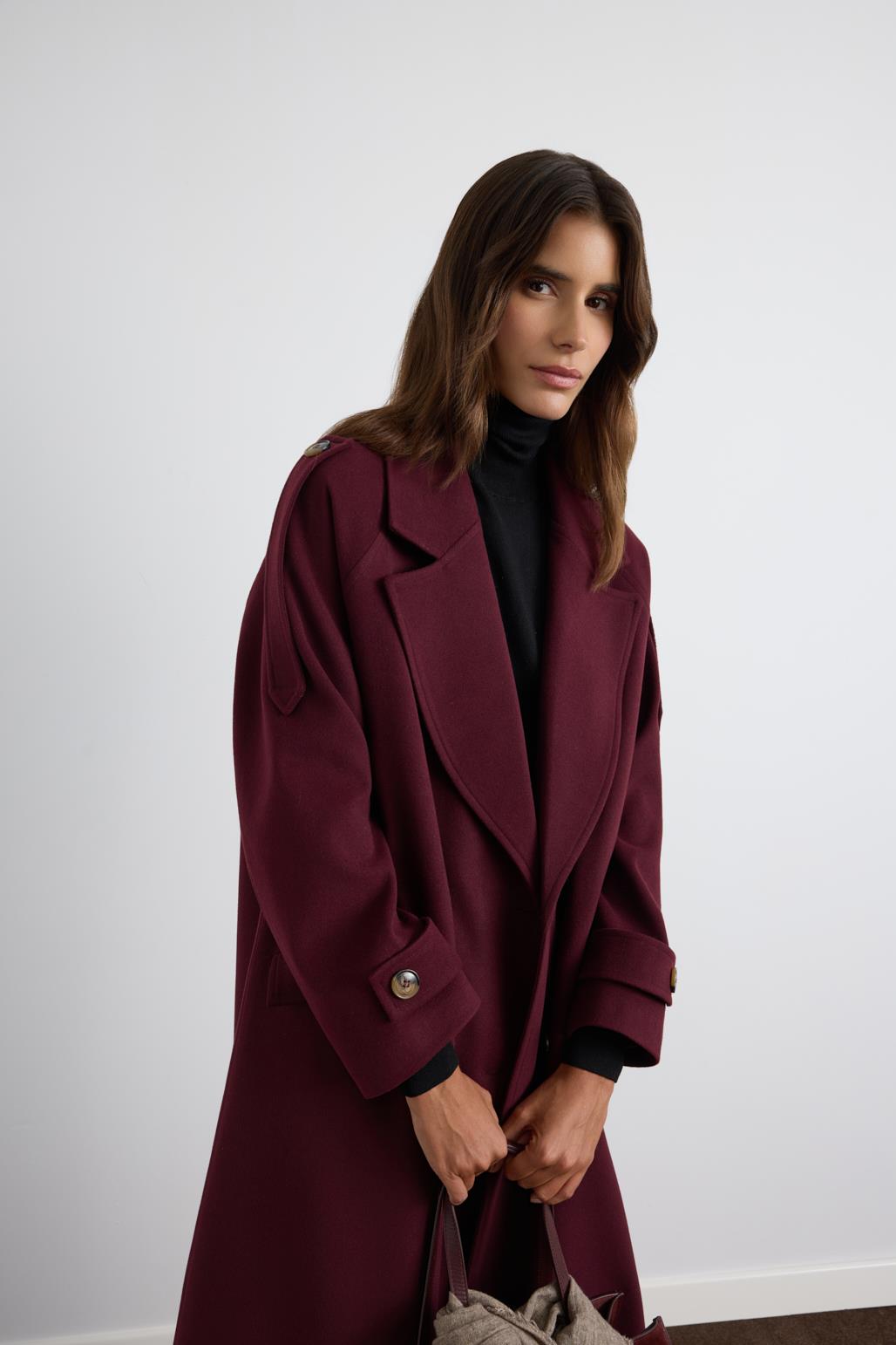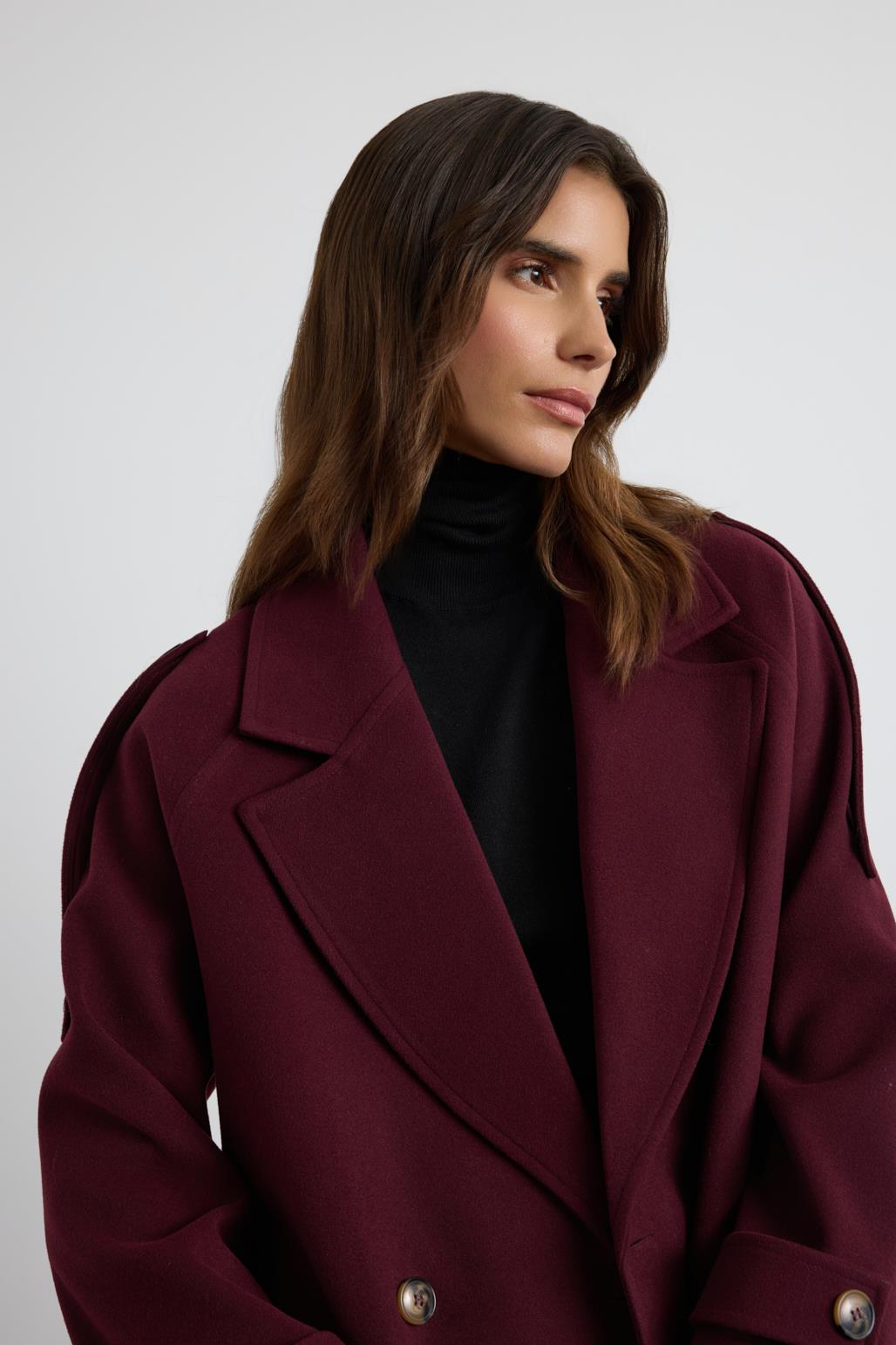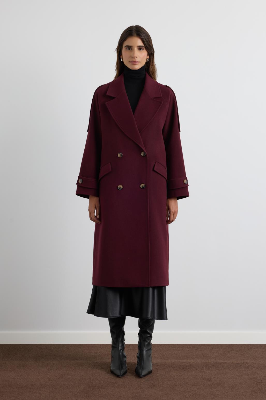 Kruvaze Yaka Apolet Detaylı Kaşe Kaban Bordo