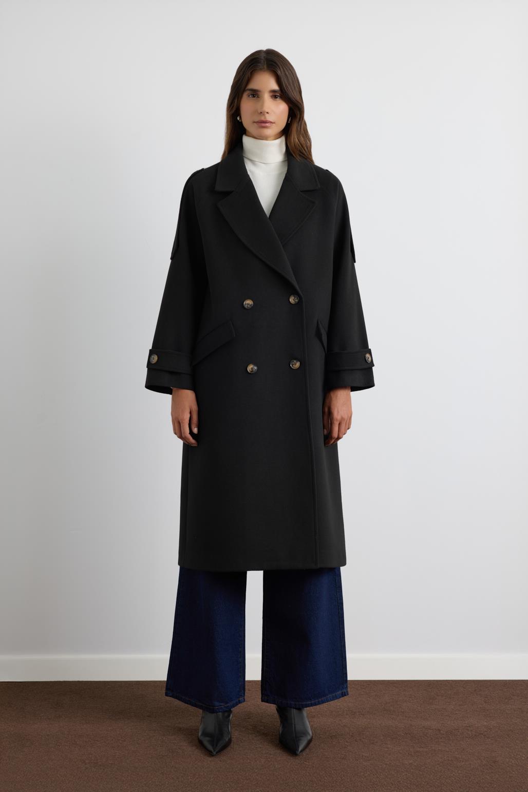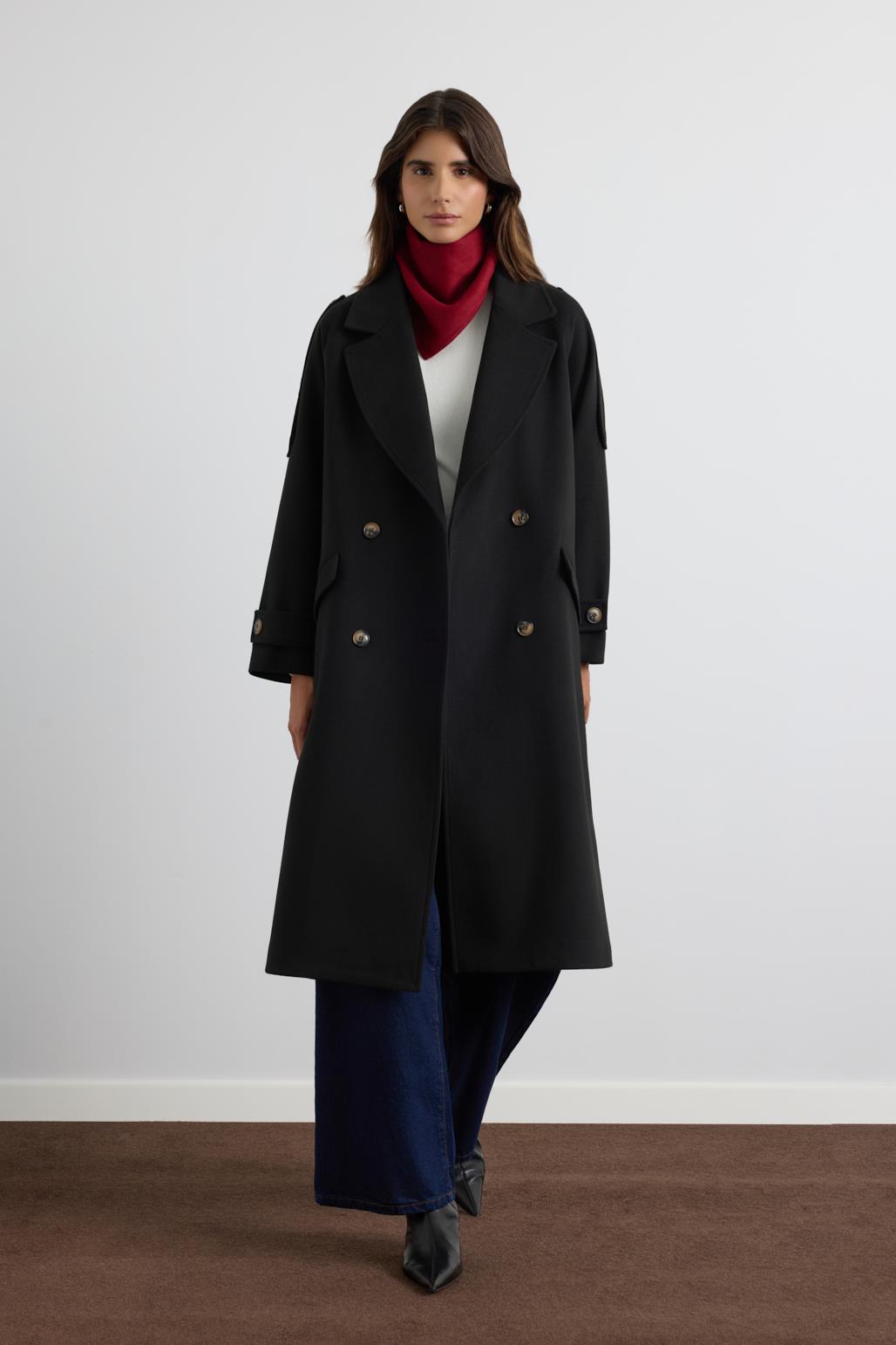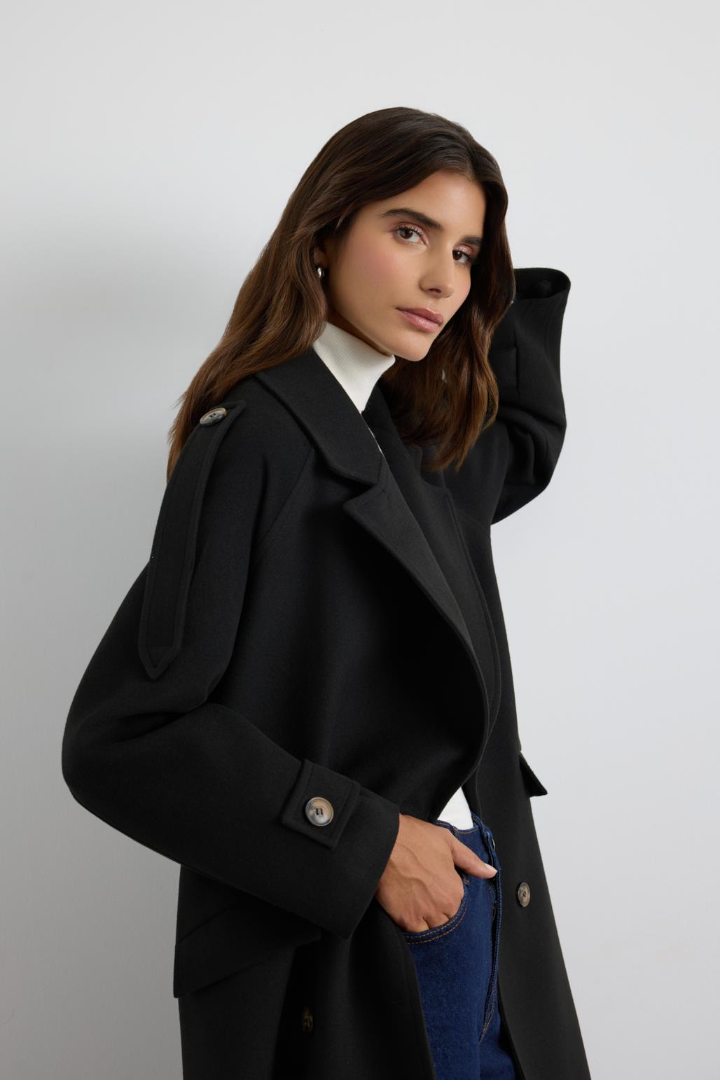 Kruvaze Yaka Apolet Detaylı Kaşe Kaban Siyah