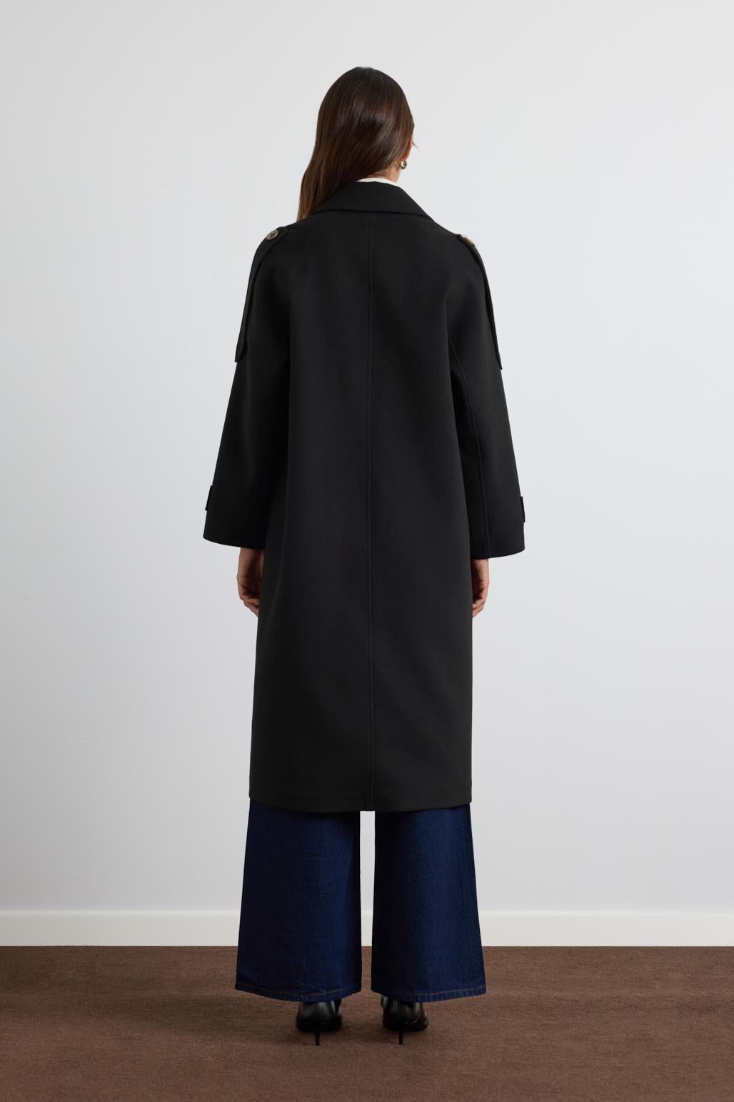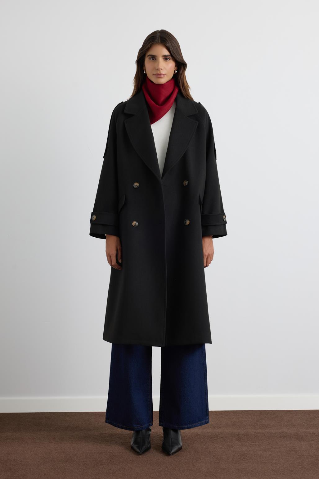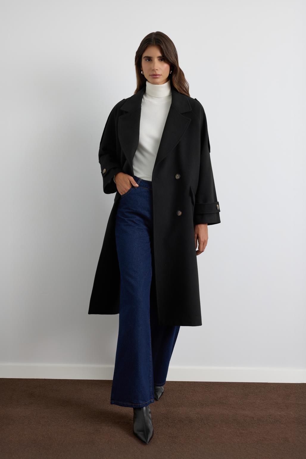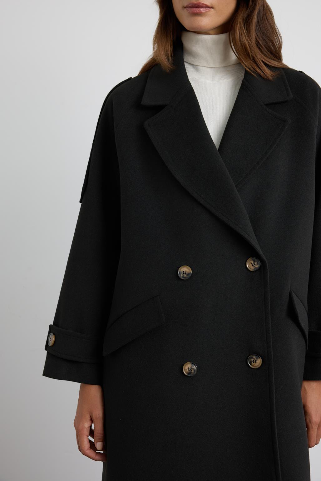 Kruvaze Yaka Apolet Detaylı Kaşe Kaban Siyah
