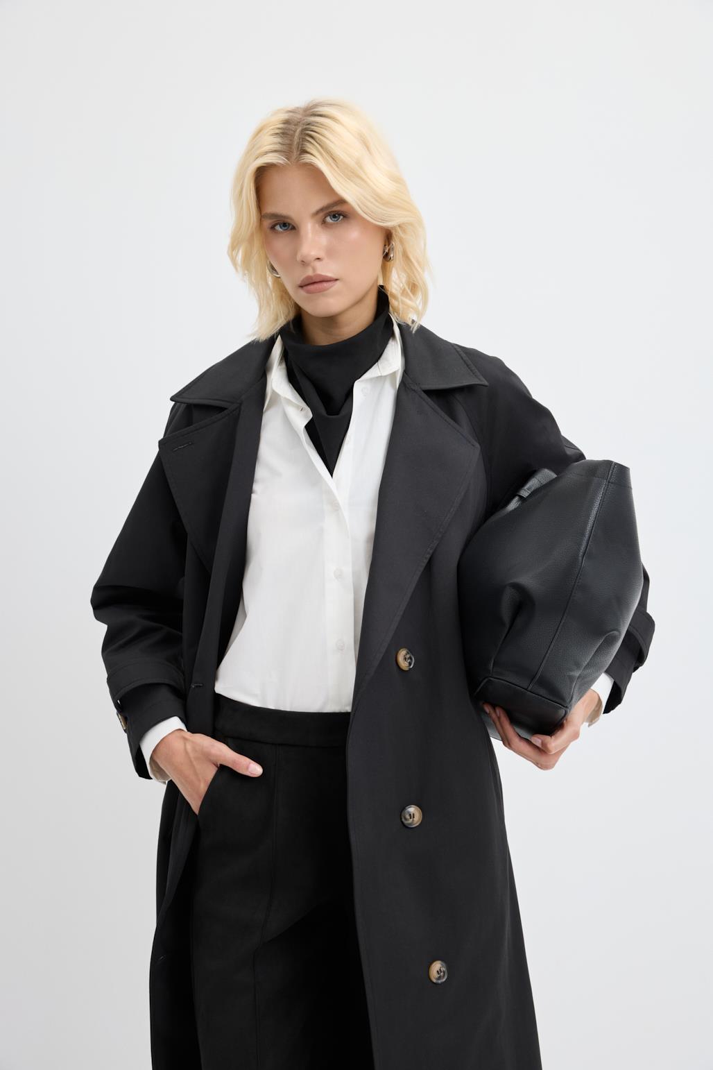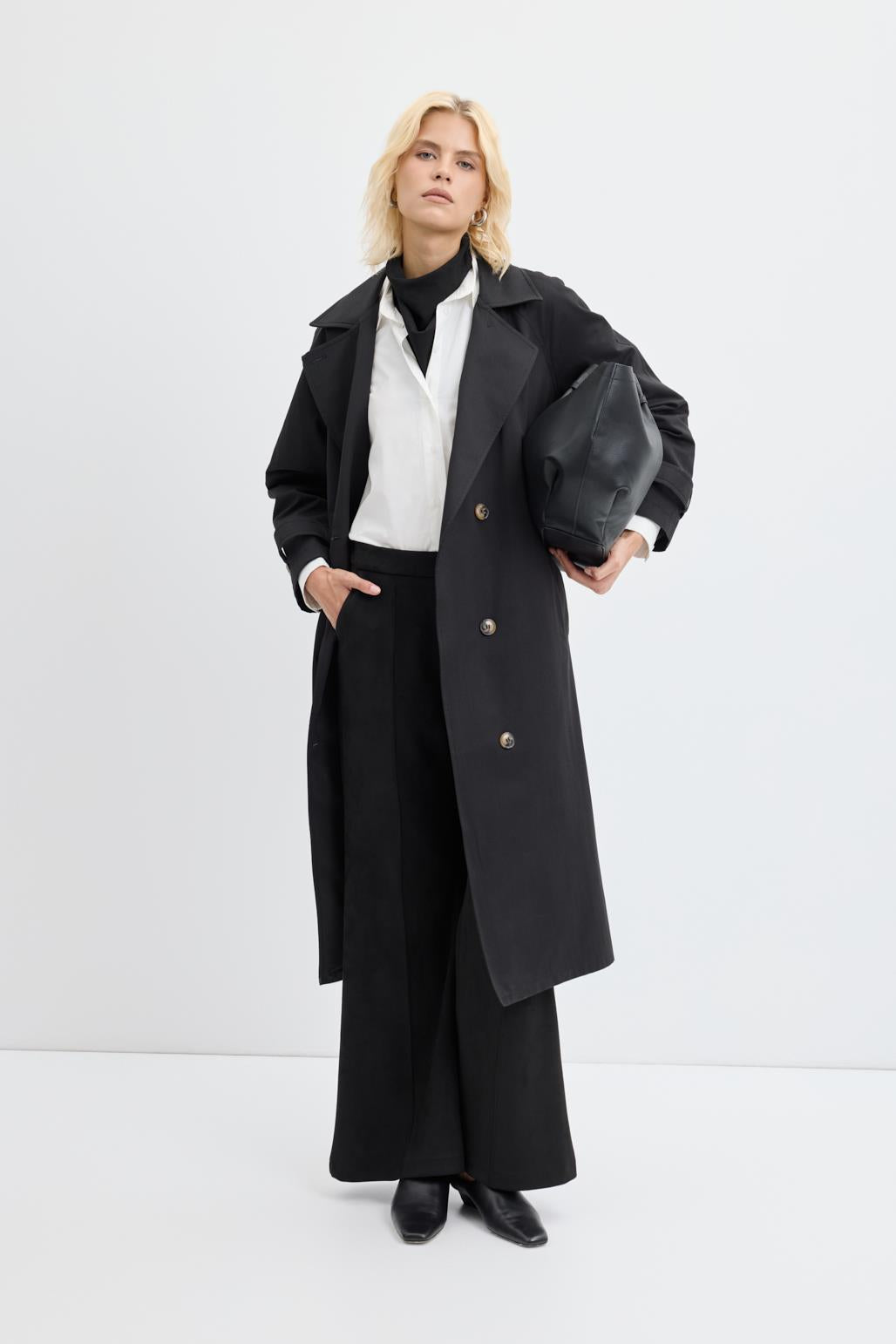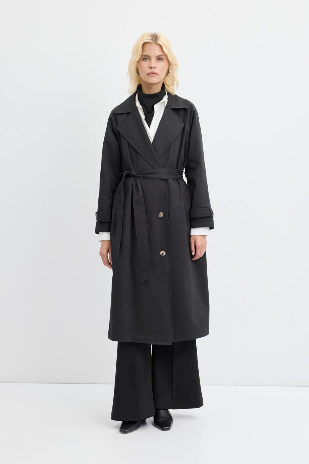 Kruvaze Yaka Astarlı Uzun Trençkot Siyah