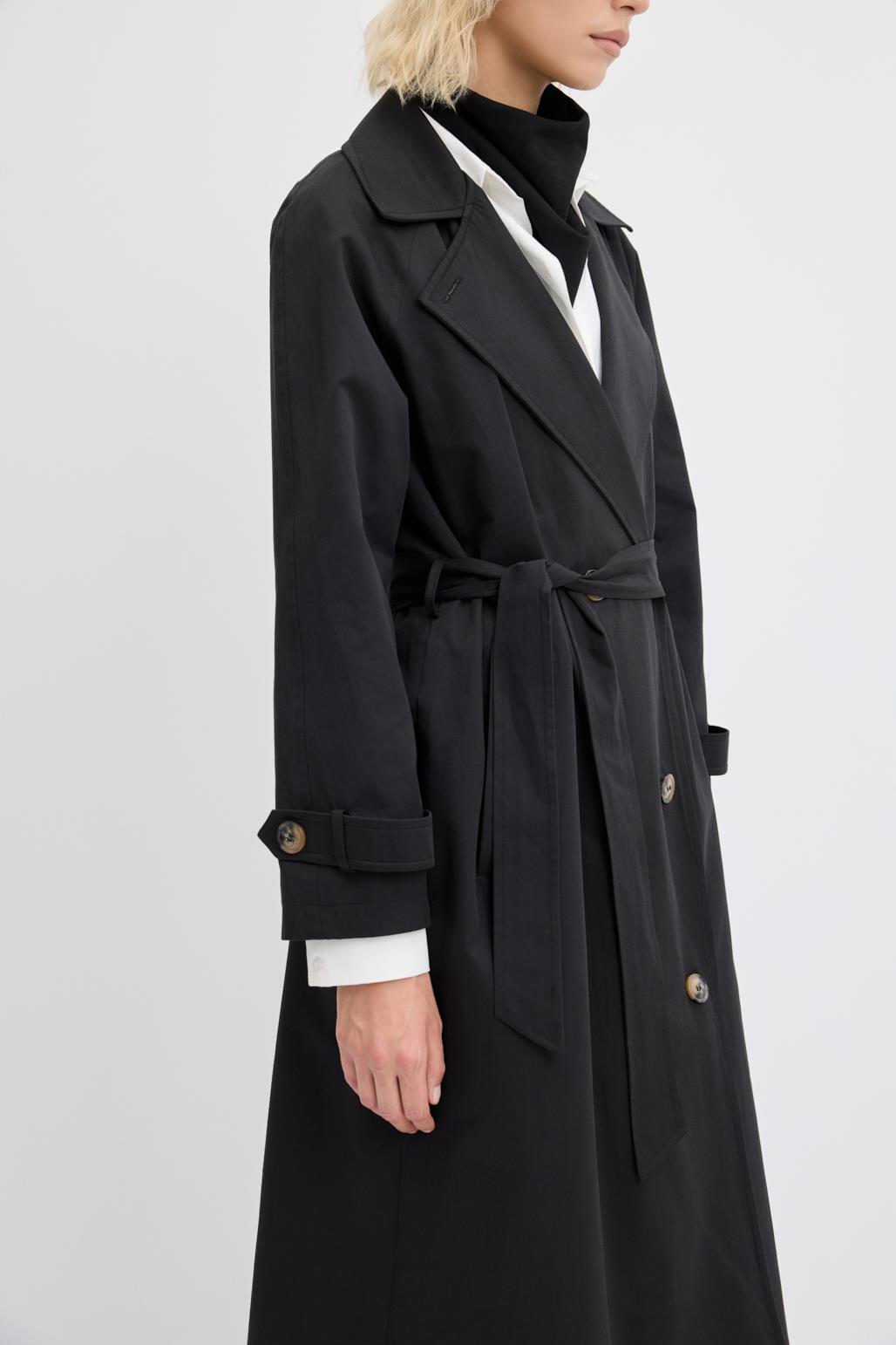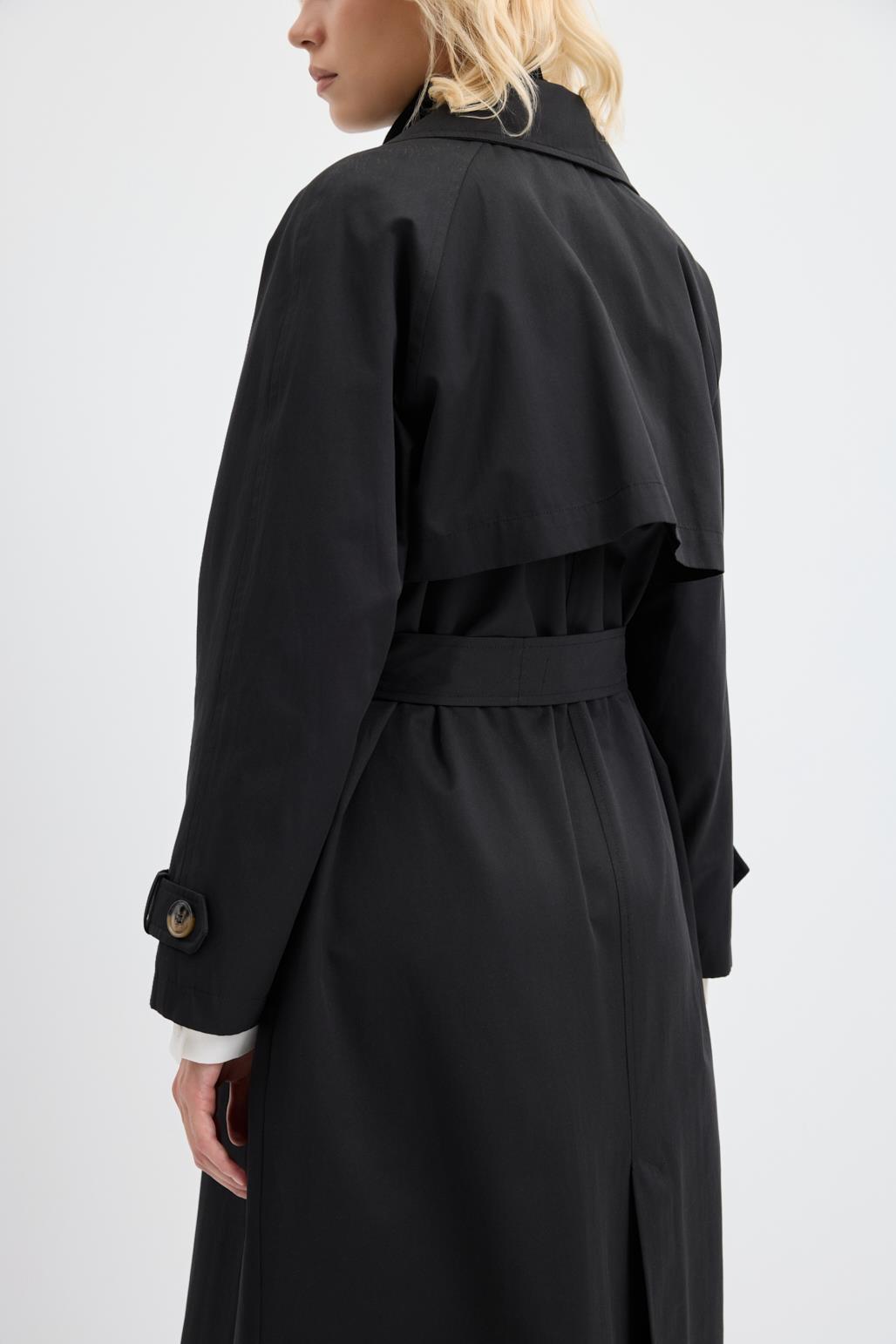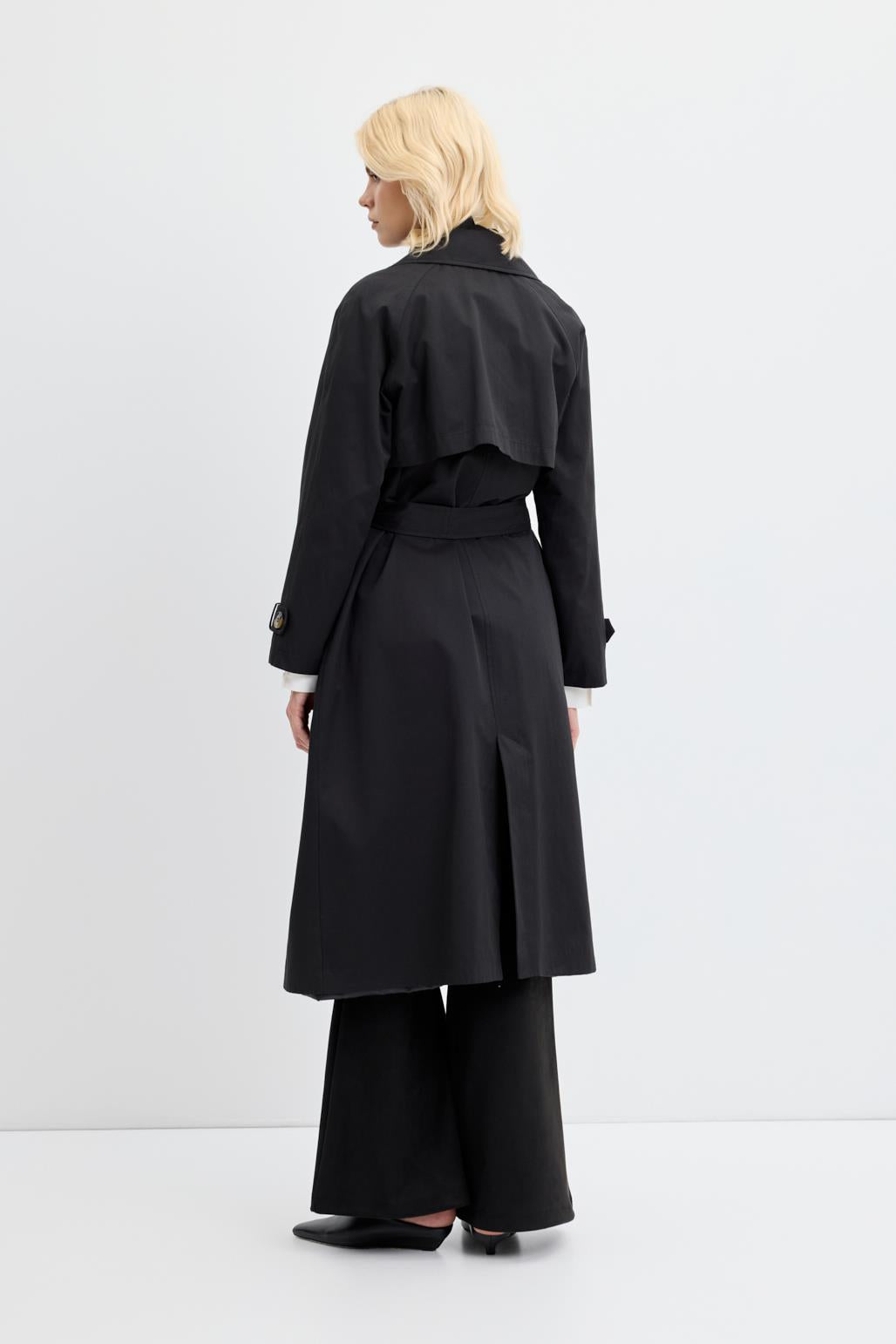 Kruvaze Yaka Astarlı Uzun Trençkot Siyah