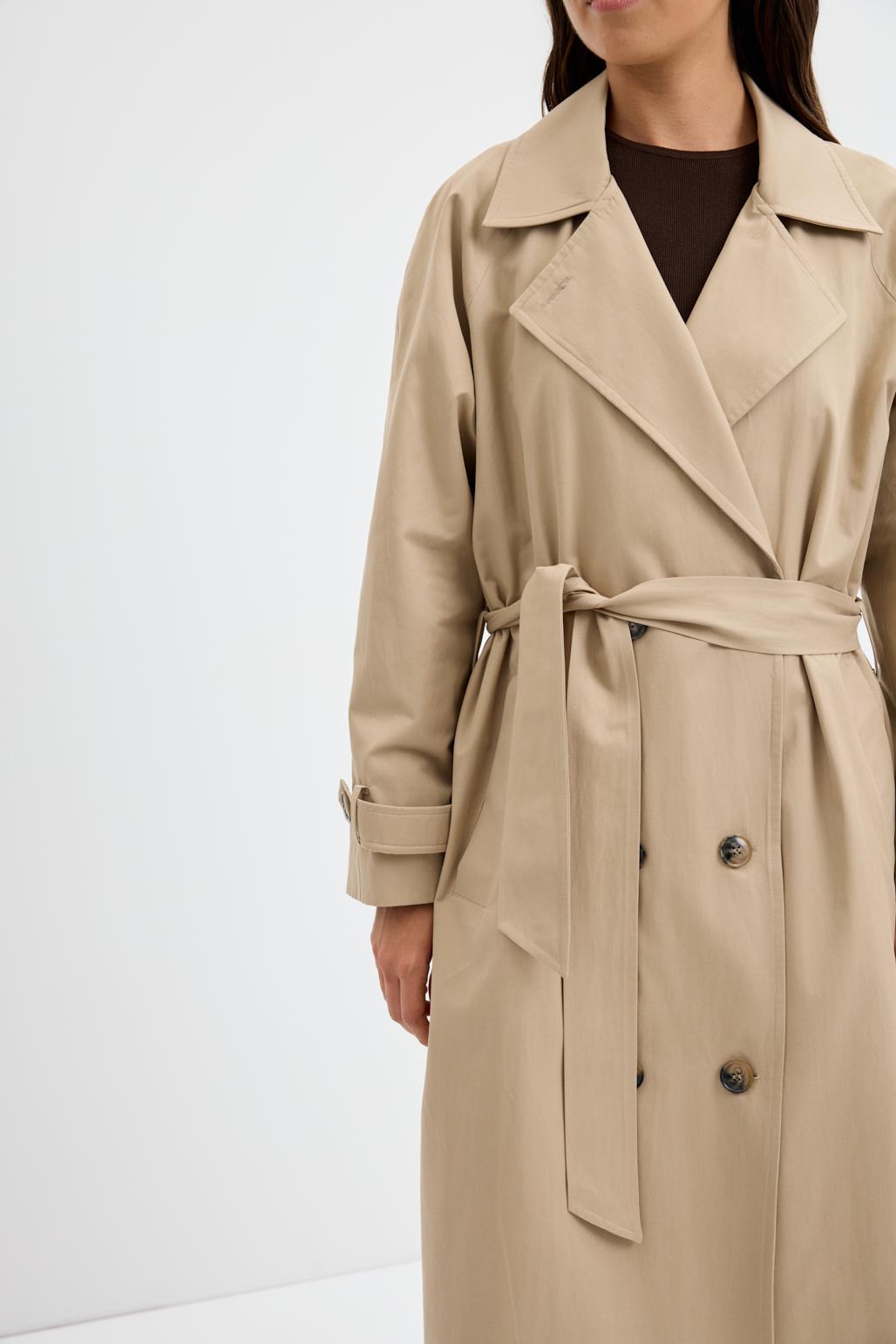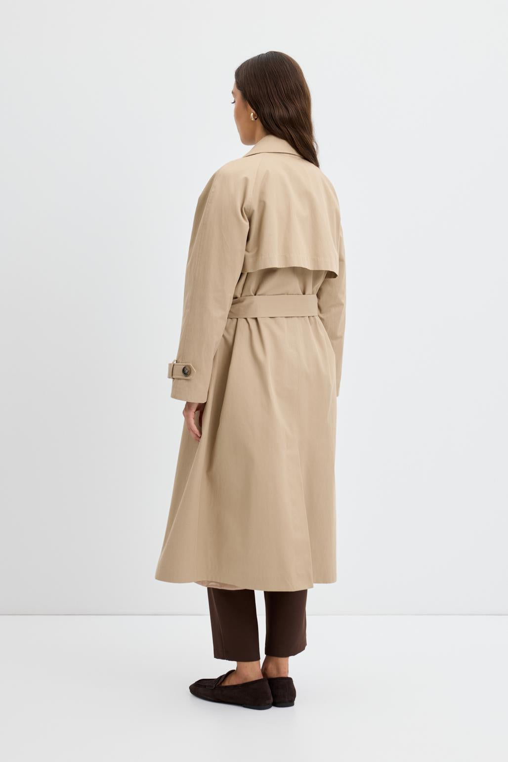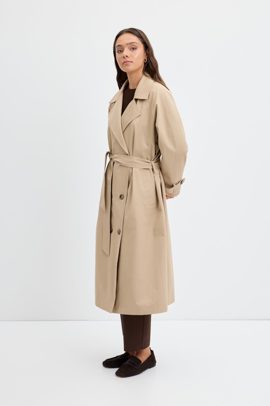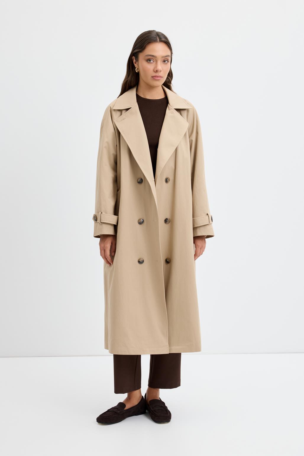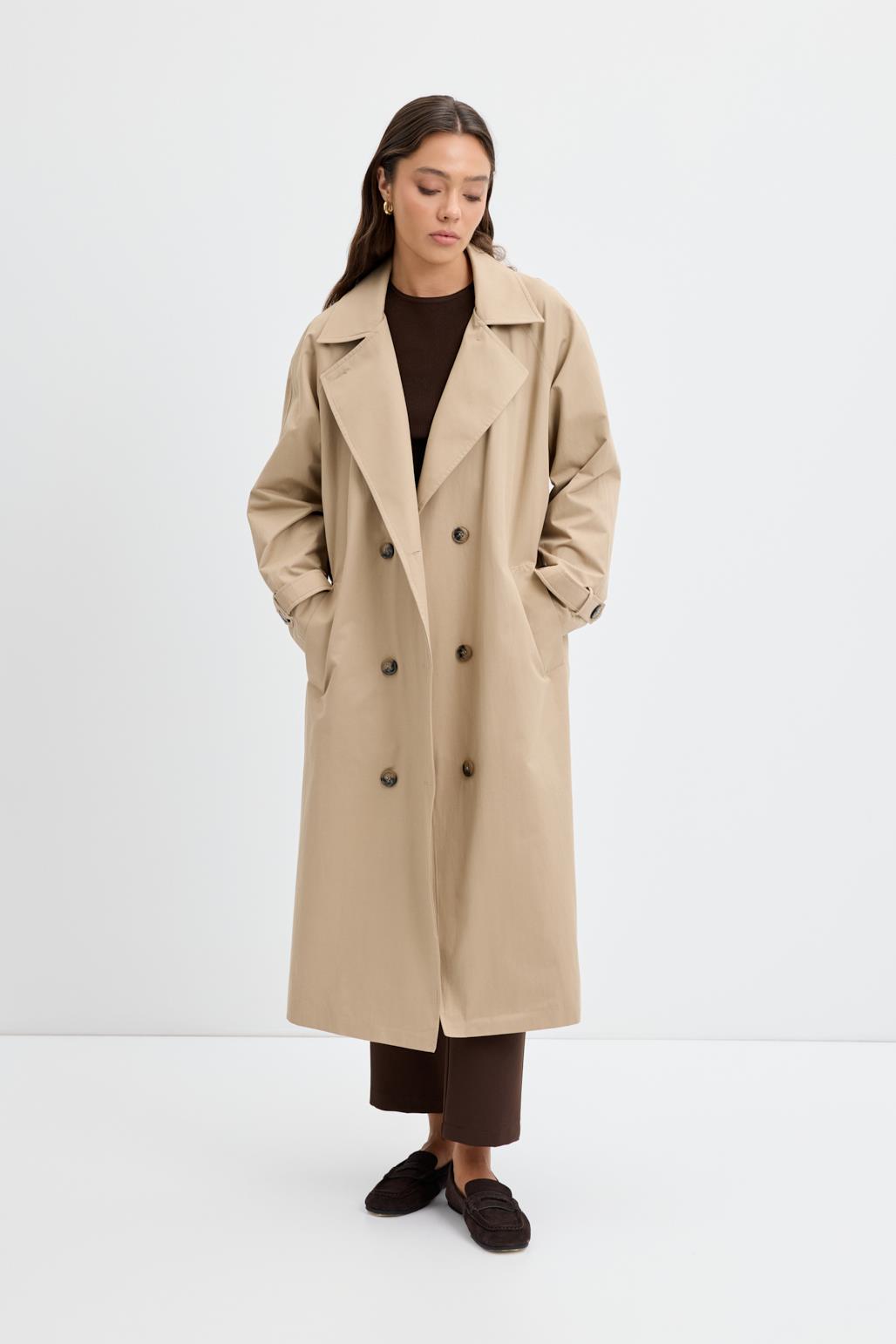 Kruvaze Yaka Astarlı Uzun Trençkot Taş