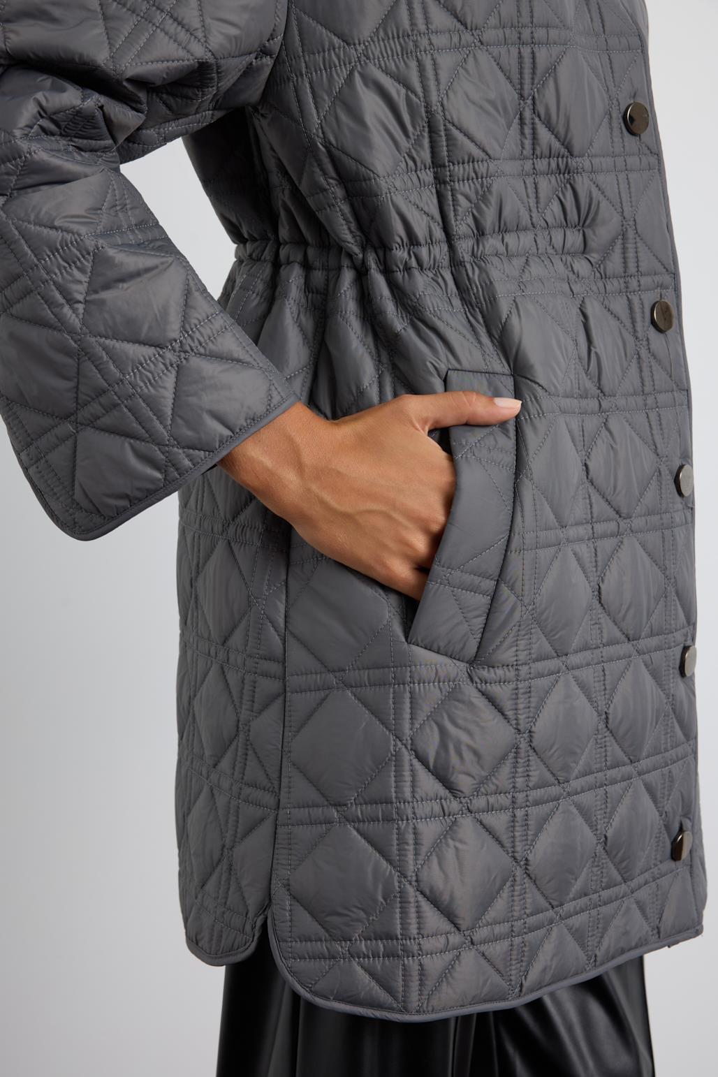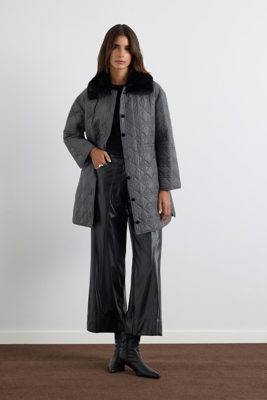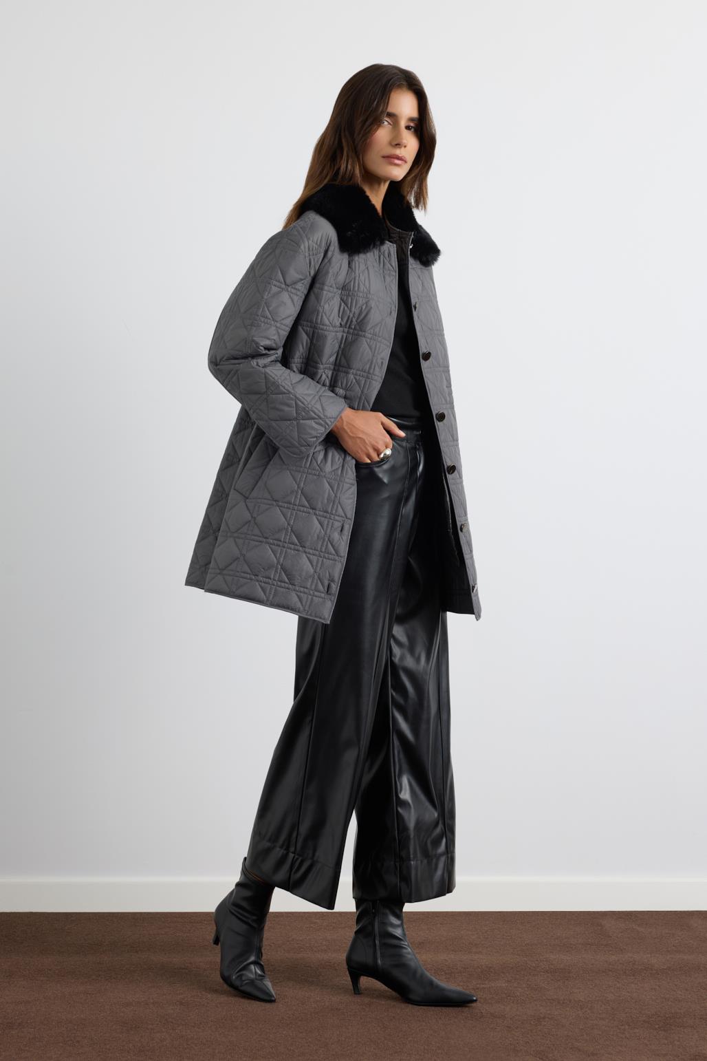 Kürk Yakalı Cepli Kapitone Mont Gri, baklava desenli dolum kumaştan üretilmiş, astarlı ve düz kesim bir dış giyim modelidir. Yan fileto cepleri pratik kullanım sağlarken, suni kürk garnili yakası görünümüne sıcak ve zarif bir dokunuş katar. İçten ayarlanabilir gizli stoper detayı sayesinde vücut hatlarınıza uyum sağlar. Black nikel düğme kapaması ise tasarımı tamamlayan şık ve kullanışlı bir ayrıntıdır.