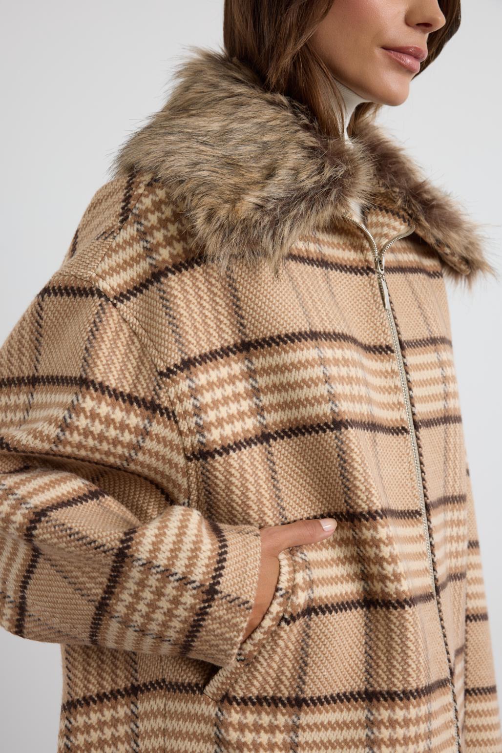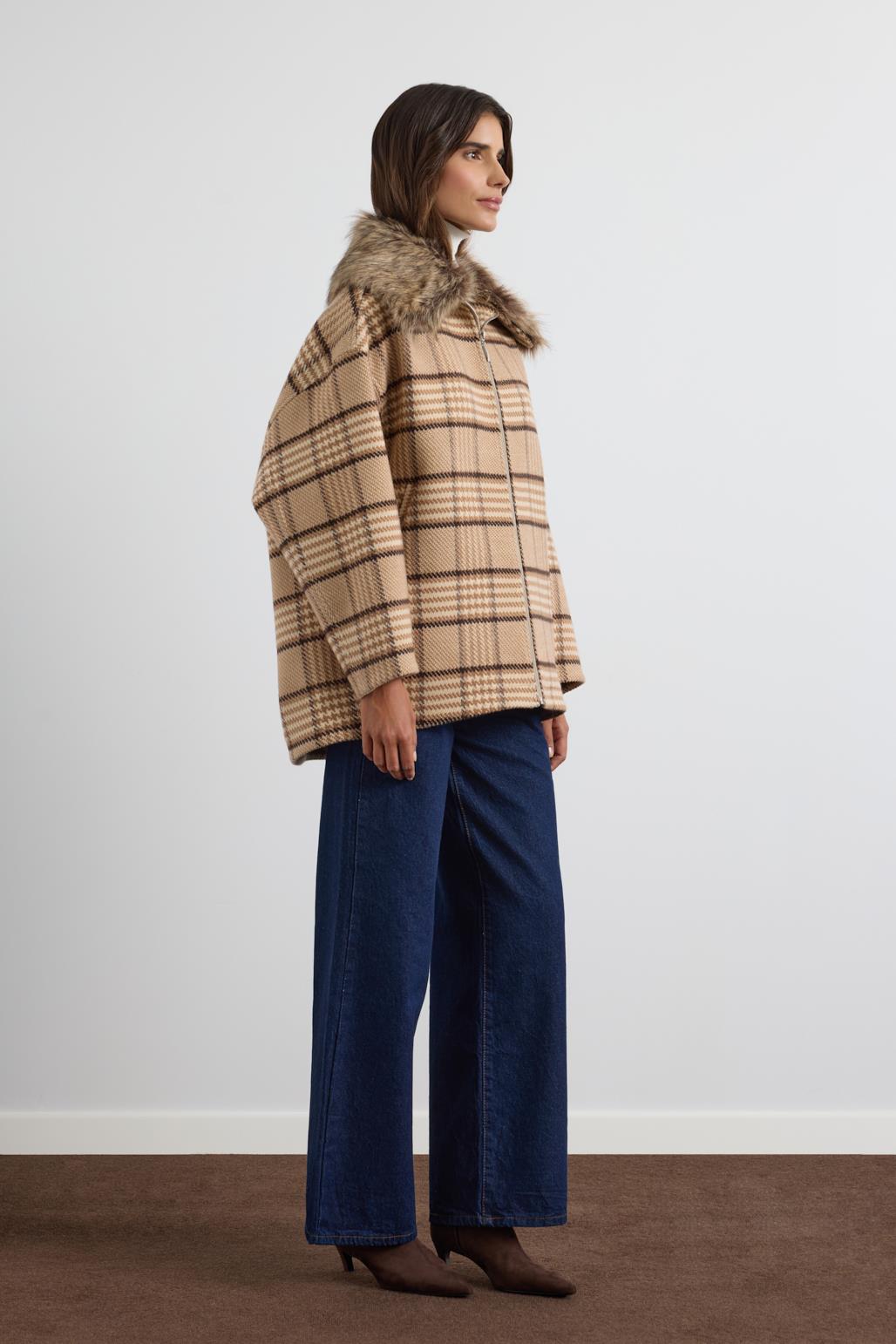 Kürk Yakalı Ekose Desen Bomber Ceket Camel