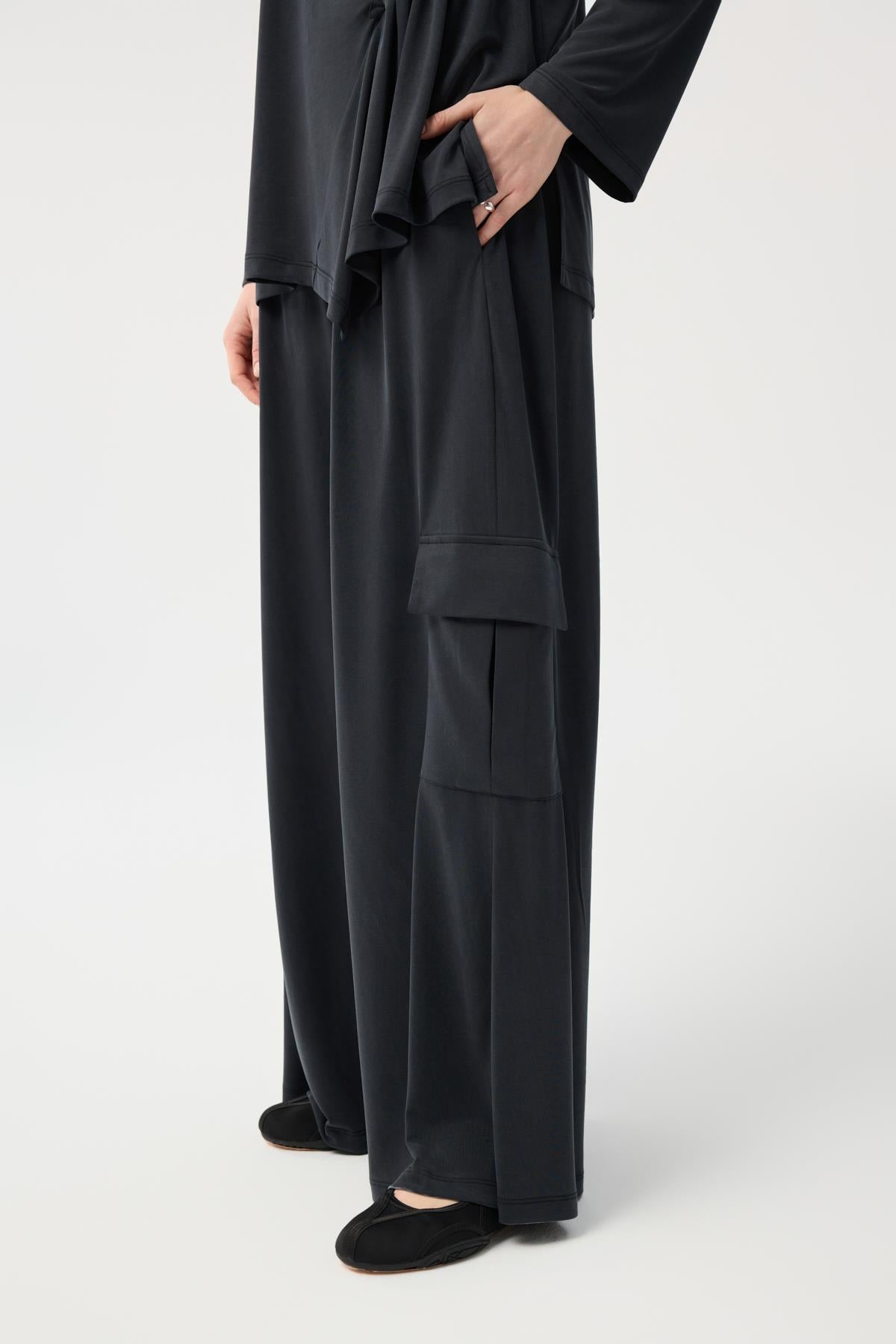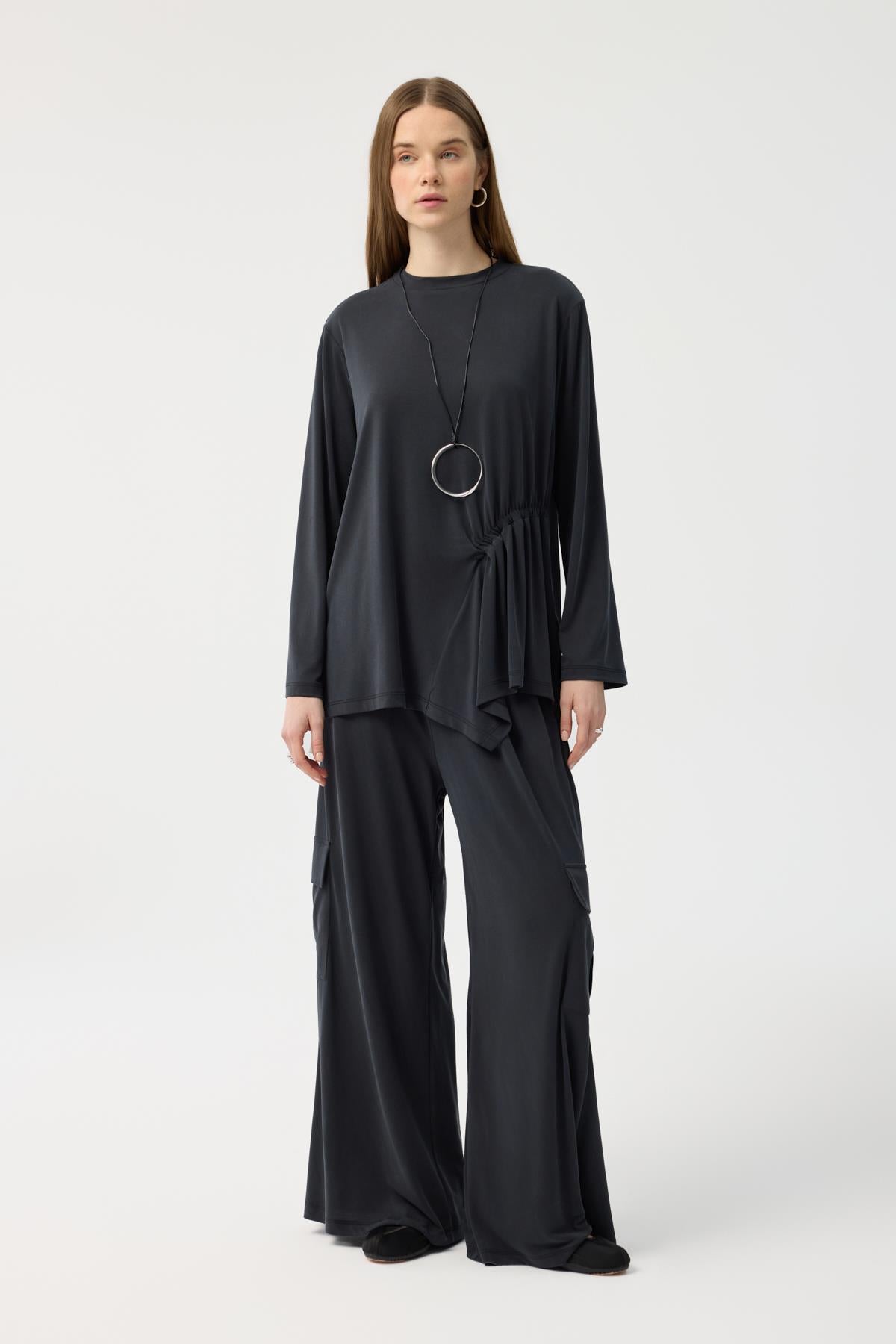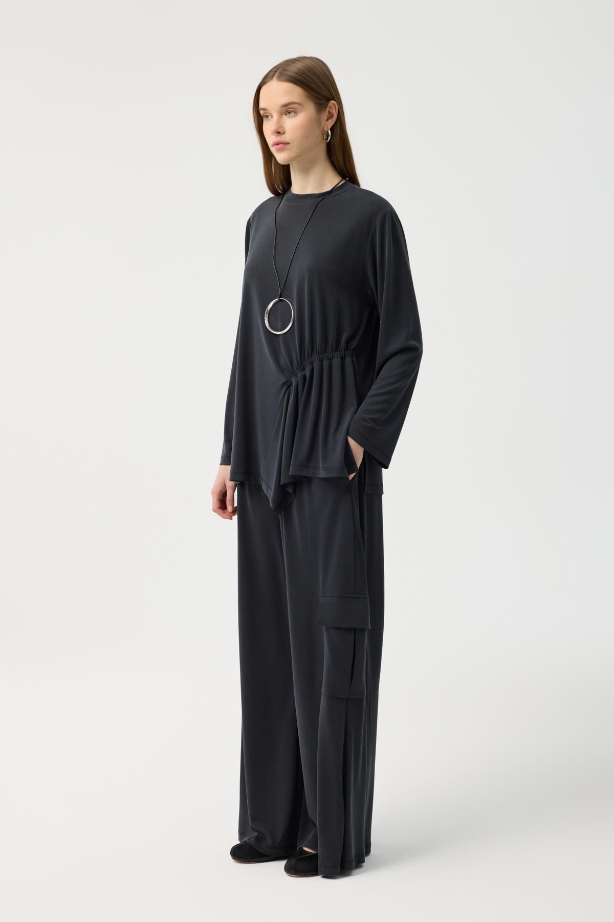Modal Cupra Kargo Cepli Takım Siyah, japone kol kesiminin yumuşak hatlarını bluzun ön bedendeki asimetrik büzgü detayıyla modern bir seviyeye taşıyor. Yüksek bel, bol paça pantolonun üzerine eklenen kargo cepler, tasarıma hem işlevsel hem de trend bir dokunuş katıyor. Tam tur lastikli bel yapısı ve modal cupranın ipeksi dökümü birleşerek, stilinizden ödün vermeden gün boyu konforlu ve güçlü bir duruş sergilemenize yardımcı oluyor.