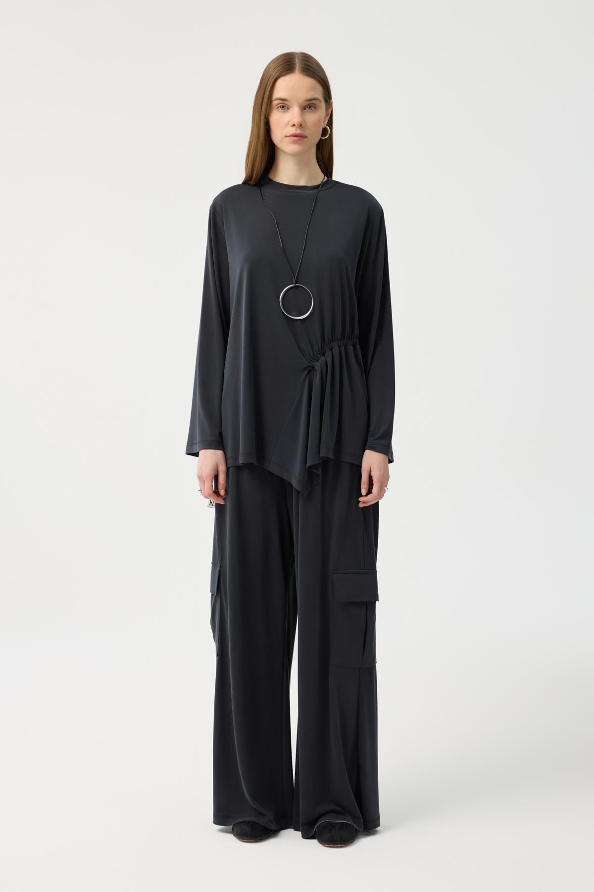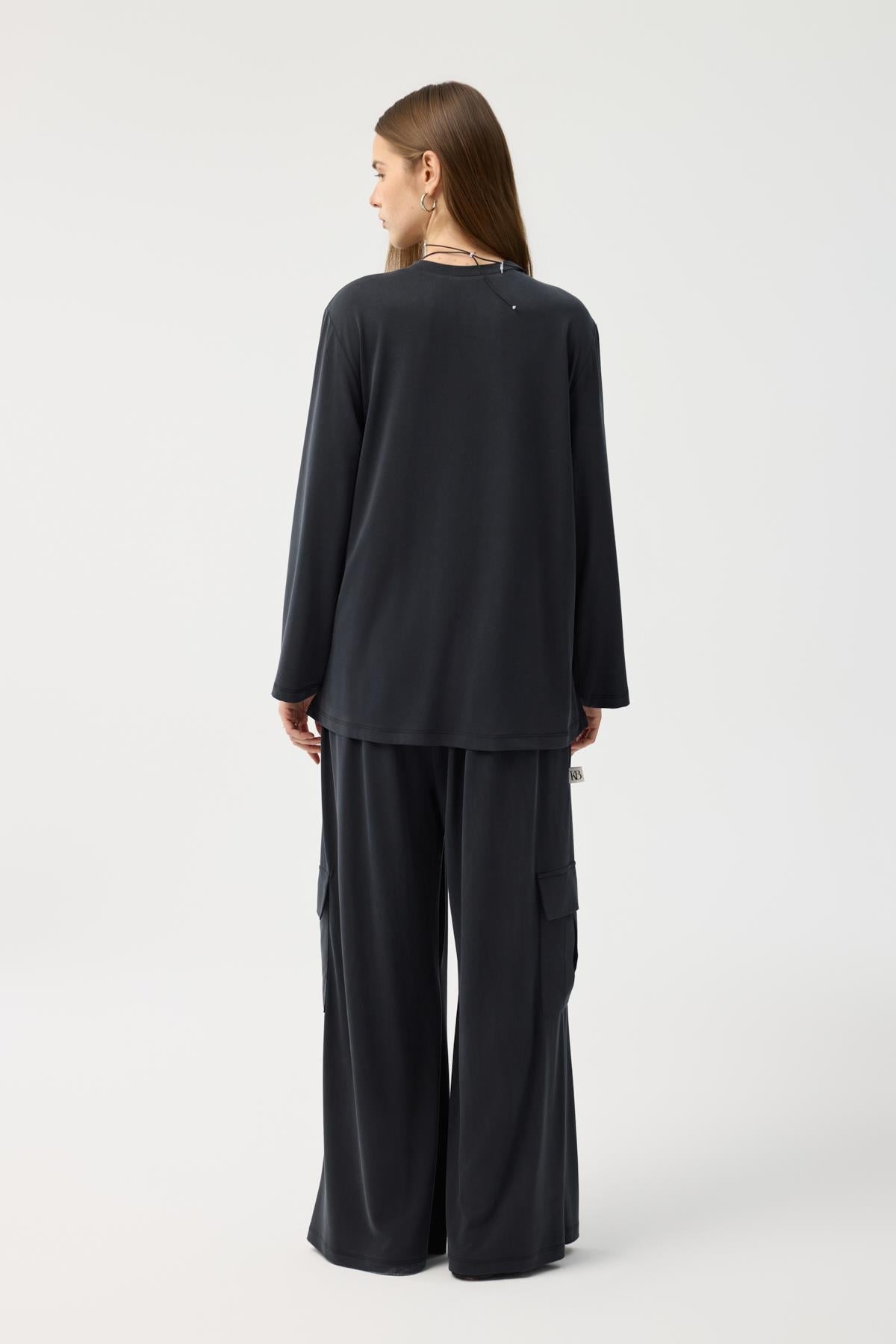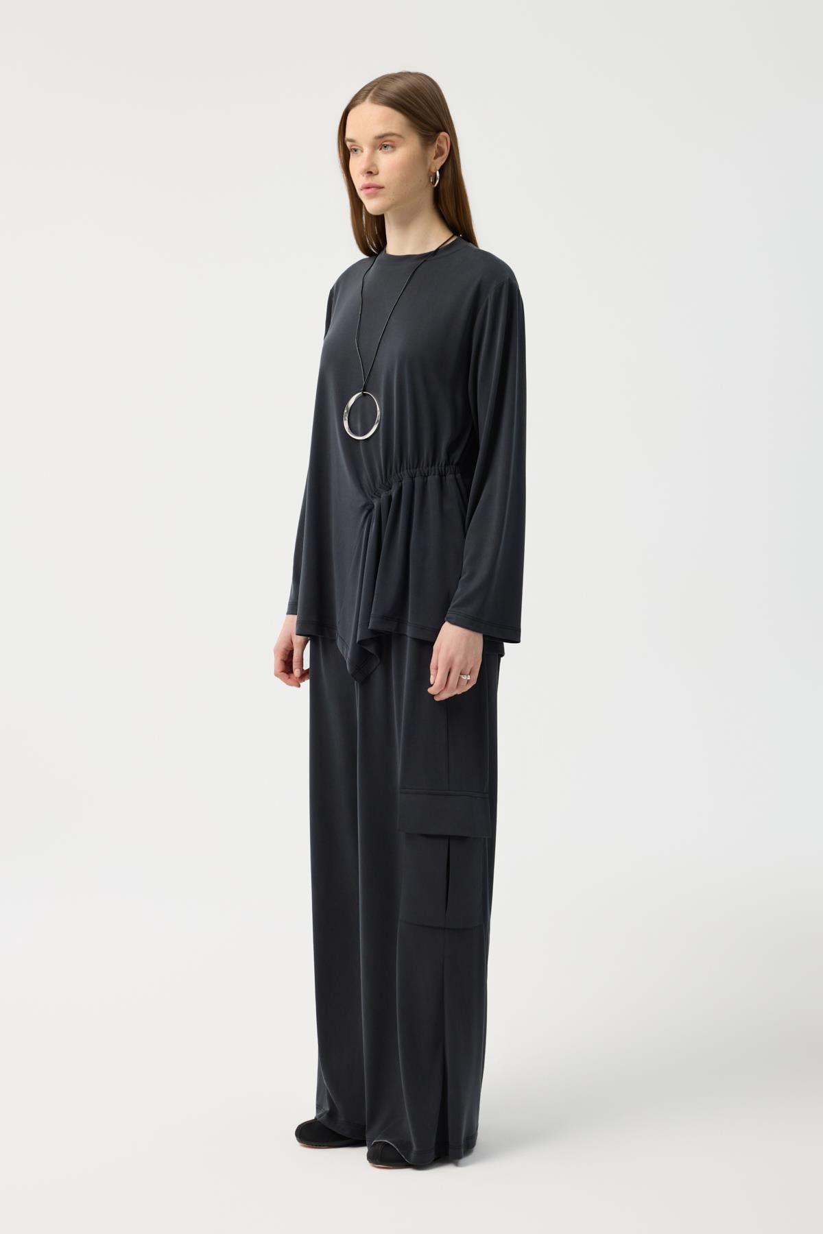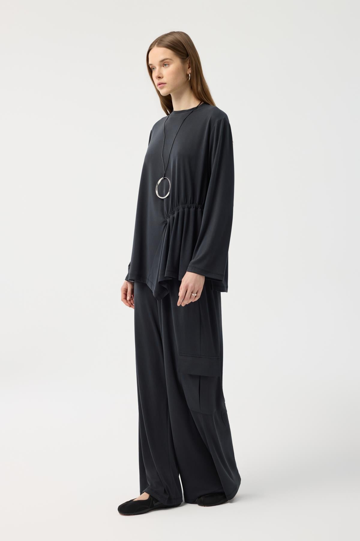 Modal Cupra Kargo Cepli Takım Siyah, japone kol kesiminin yumuşak hatlarını bluzun ön bedendeki asimetrik büzgü detayıyla modern bir seviyeye taşıyor. Yüksek bel, bol paça pantolonun üzerine eklenen kargo cepler, tasarıma hem işlevsel hem de trend bir dokunuş katıyor. Tam tur lastikli bel yapısı ve modal cupranın ipeksi dökümü birleşerek, stilinizden ödün vermeden gün boyu konforlu ve güçlü bir duruş sergilemenize yardımcı oluyor.