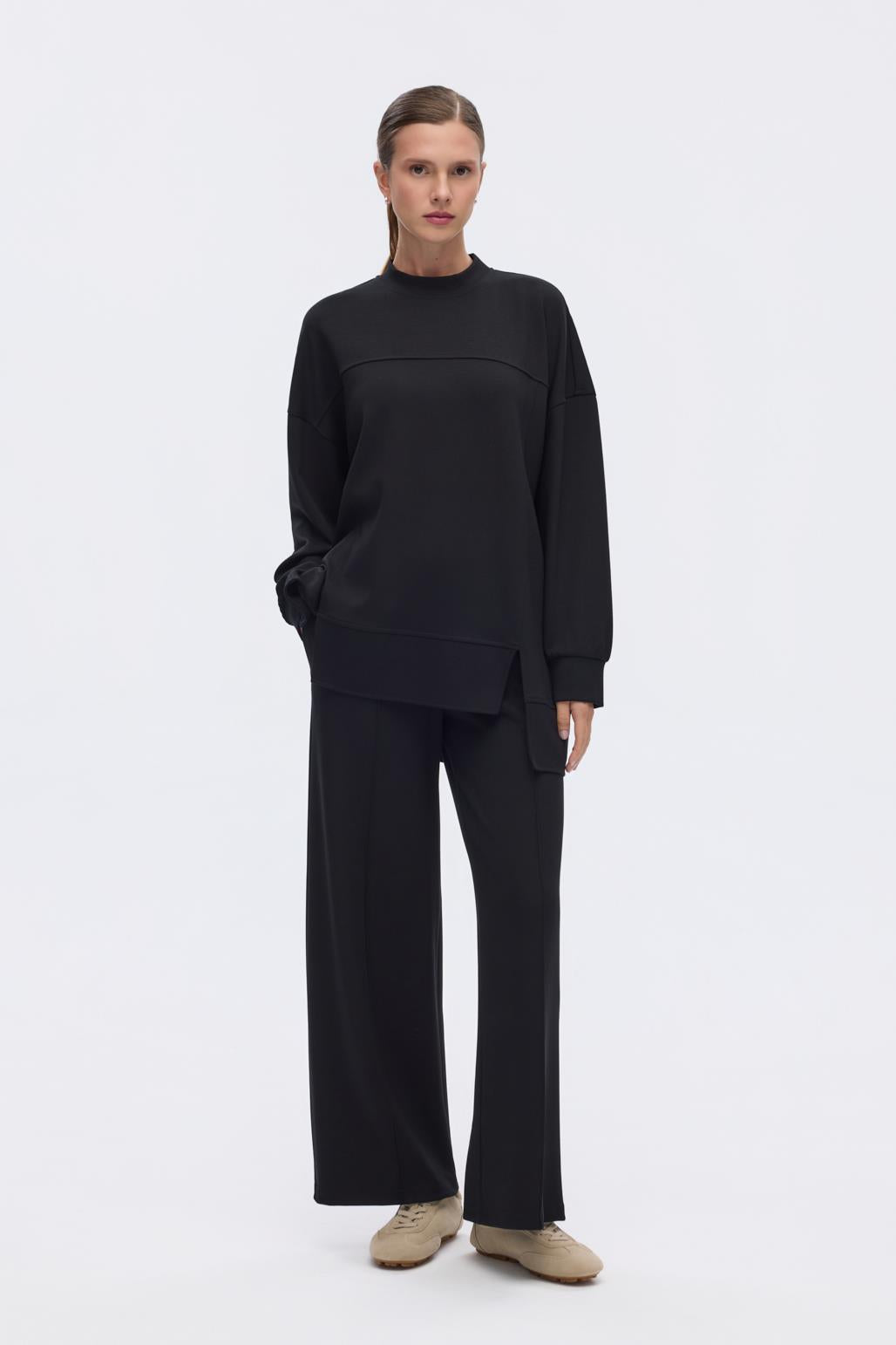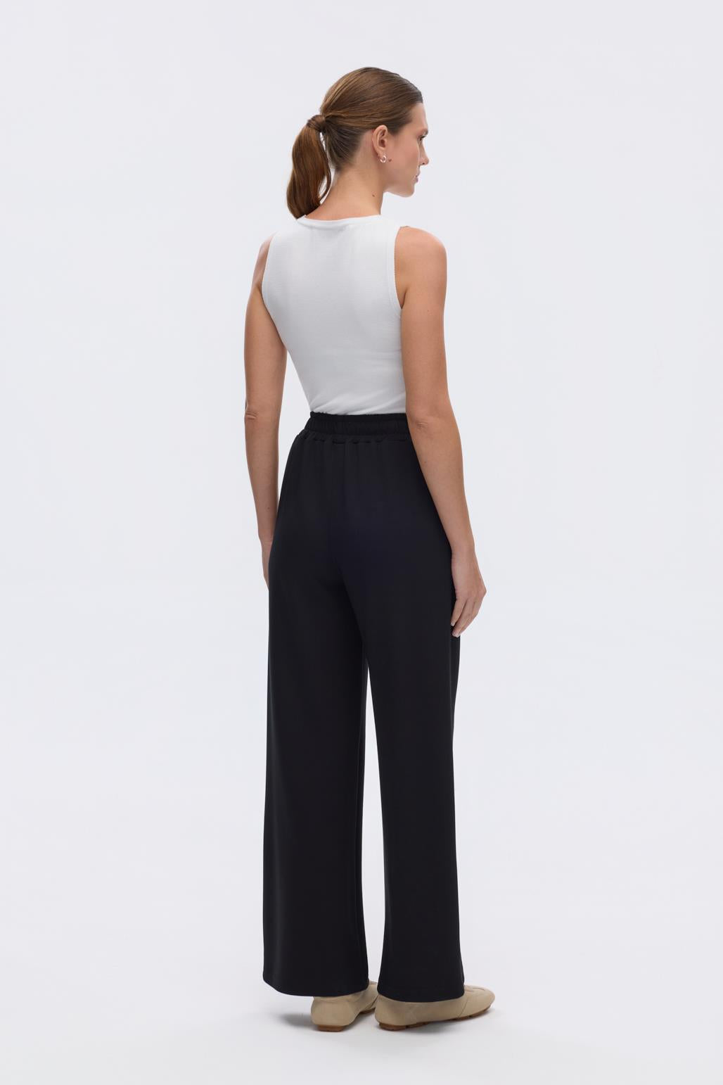 Modal Örme Bol Kesim Pantolon Siyah, esnek ve yumuşak dokulu kumaşı sayesinde rahat ve konforlu olmanızı sağlar. Yüksek bel ve önden dikiş detayı ile fit, toparlayıcı bir görünüm vadeder.