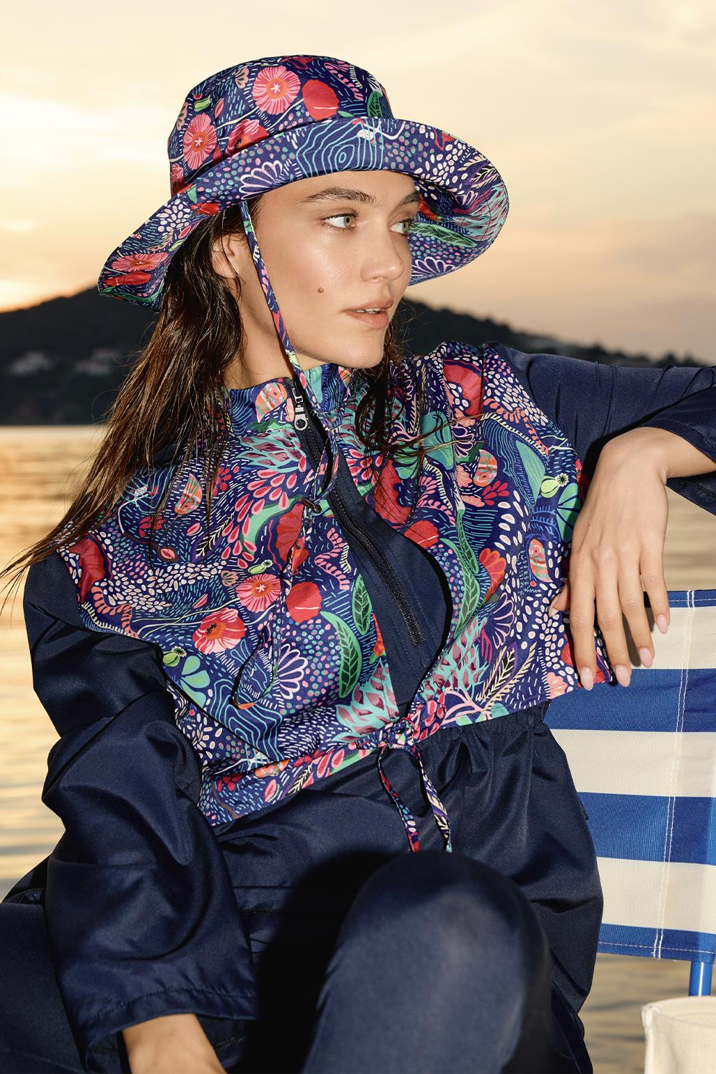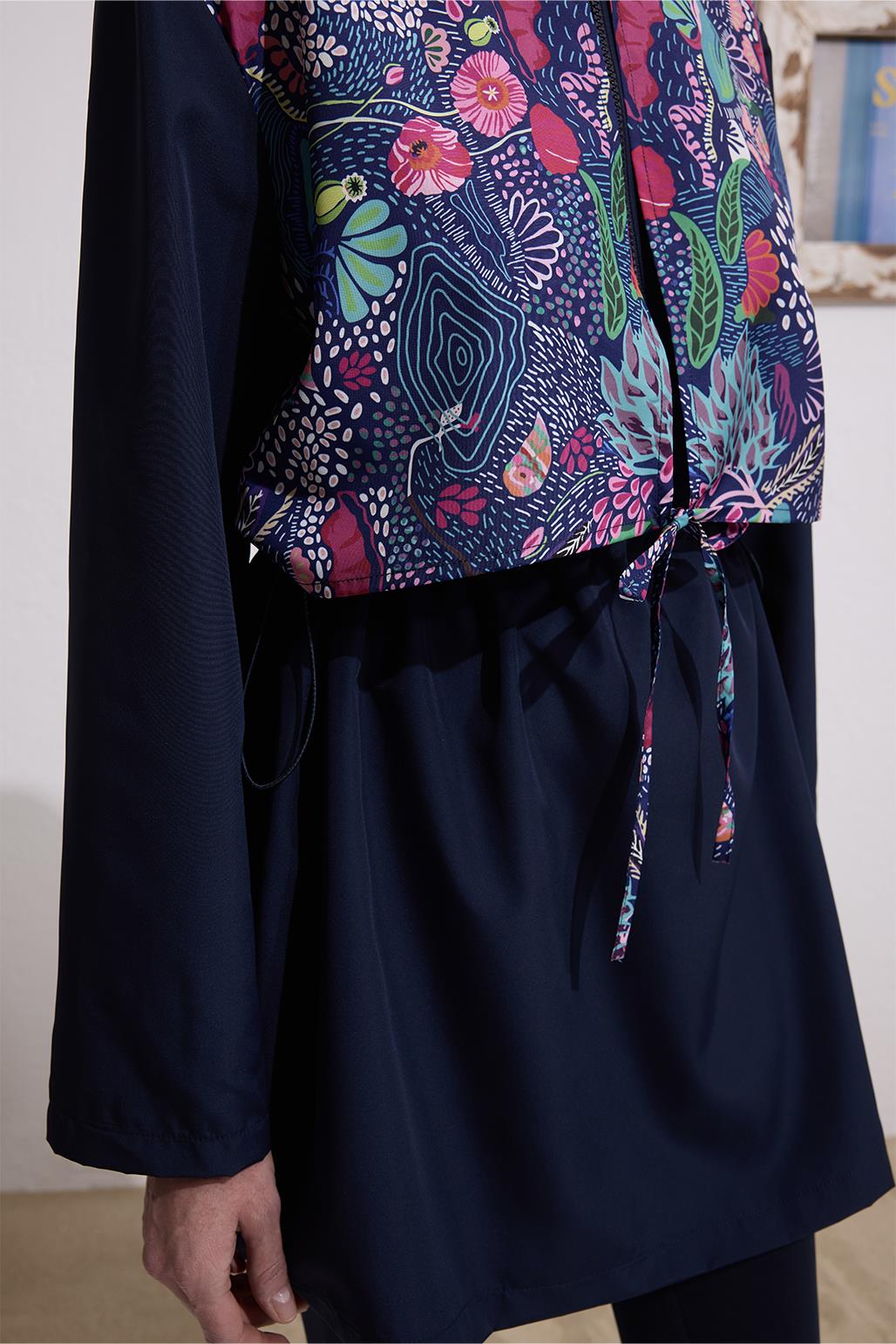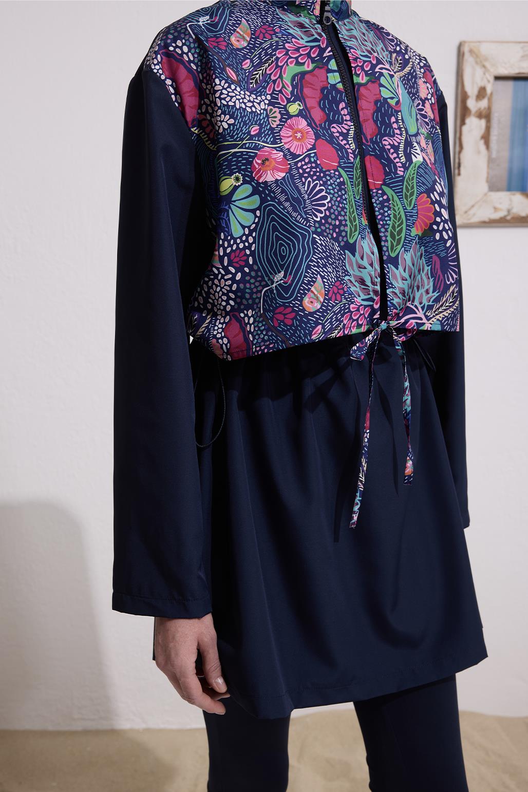 Paraşüt Desenli Bağlamalı Tesettür Mayo Takım Lacivert, hafif yapısı ve çabuk kuruyan ince paraşüt kumaşıyla yaz aylarında konfor sunan bu tesettür mayo takımı, şıklığı ve işlevselliği bir araya getiriyor. Ön bedeni desenli ve renkli paraşüt kumaşla hareketlendirilen model, dik yaka ve fermuar detayı ile modern bir duruş sergiliyor.