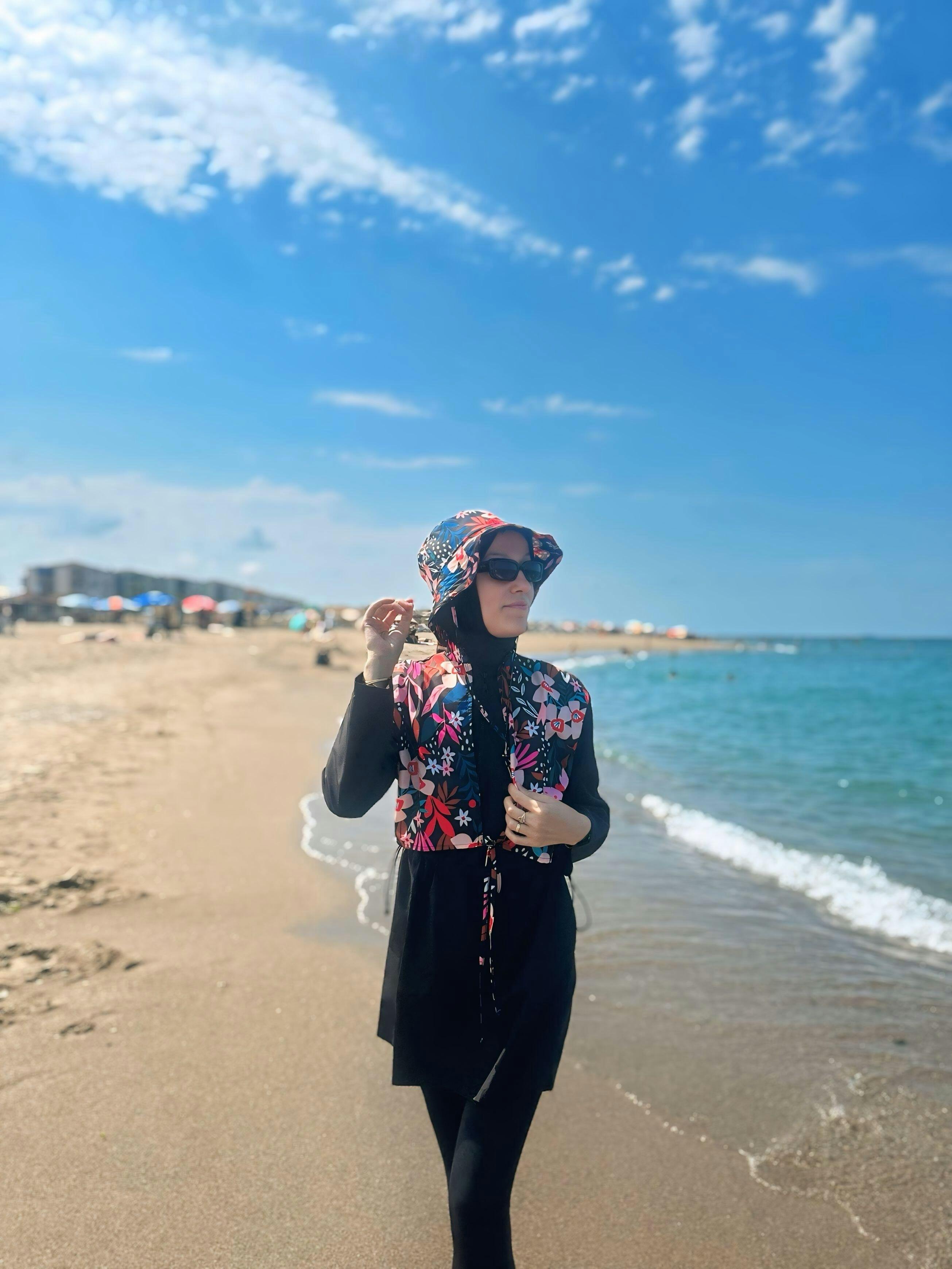 Paraşüt Desenli Bağlamalı Tesettür Mayo Takım Siyah, hafif yapısı ve çabuk kuruyan ince paraşüt kumaşıyla yaz aylarında konfor sunan bu tesettür mayo takımı, şıklığı ve işlevselliği bir araya getiriyor. Ön bedeni desenli ve renkli paraşüt kumaşla hareketlendirilen model, dik yaka ve fermuar detayı ile modern bir duruş sergiliyor.