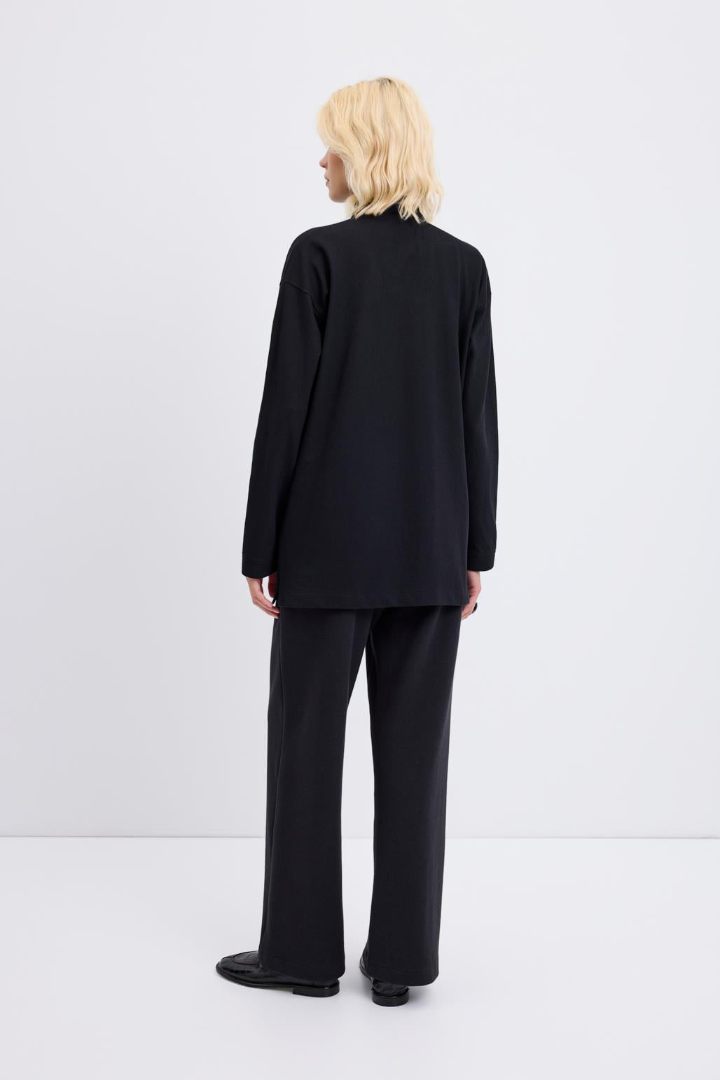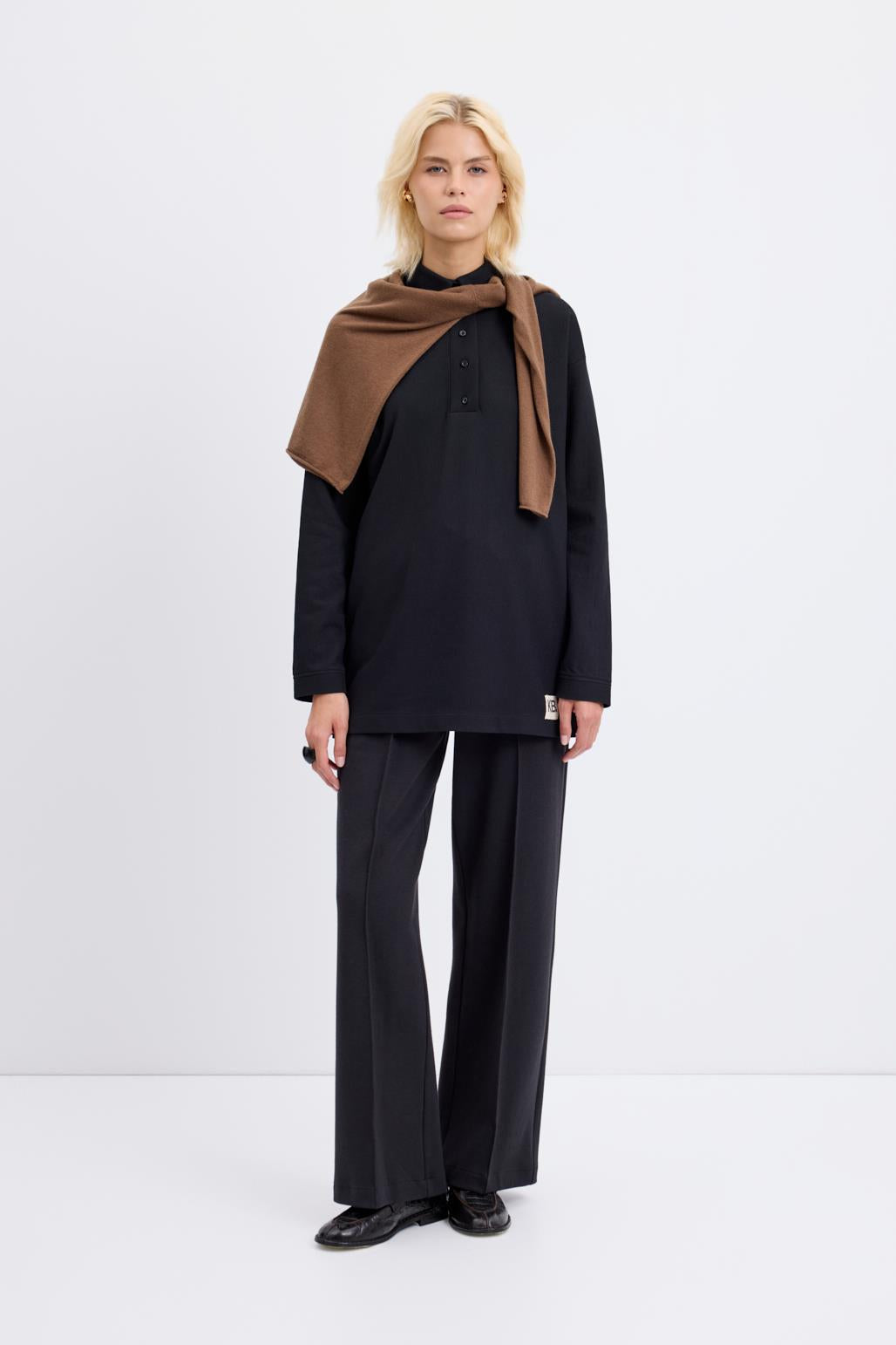 Polo Yaka Yandan Yırtmaçlı Sweatshirt Siyah, diegonel iki iplik kumaşıyla hem yumuşak hem tok bir duruş sunar. Klasik yakası ve geniş patlı düğme kapaması gömlek formuna yakın bir stil yaratırken, bilezik manşet ve yan yırtmaç detayları hareket özgürlüğü sağlar. Düz kesimi sade bir görünüm yakalayan bu model günlük kombinlere kolayca uyum sağlar. Rahatlığı klasik detaylarla birleştiren kullanışlı bir sweatshirt olarak gardırobunuzda güçlü bir yer edinmeye aday.