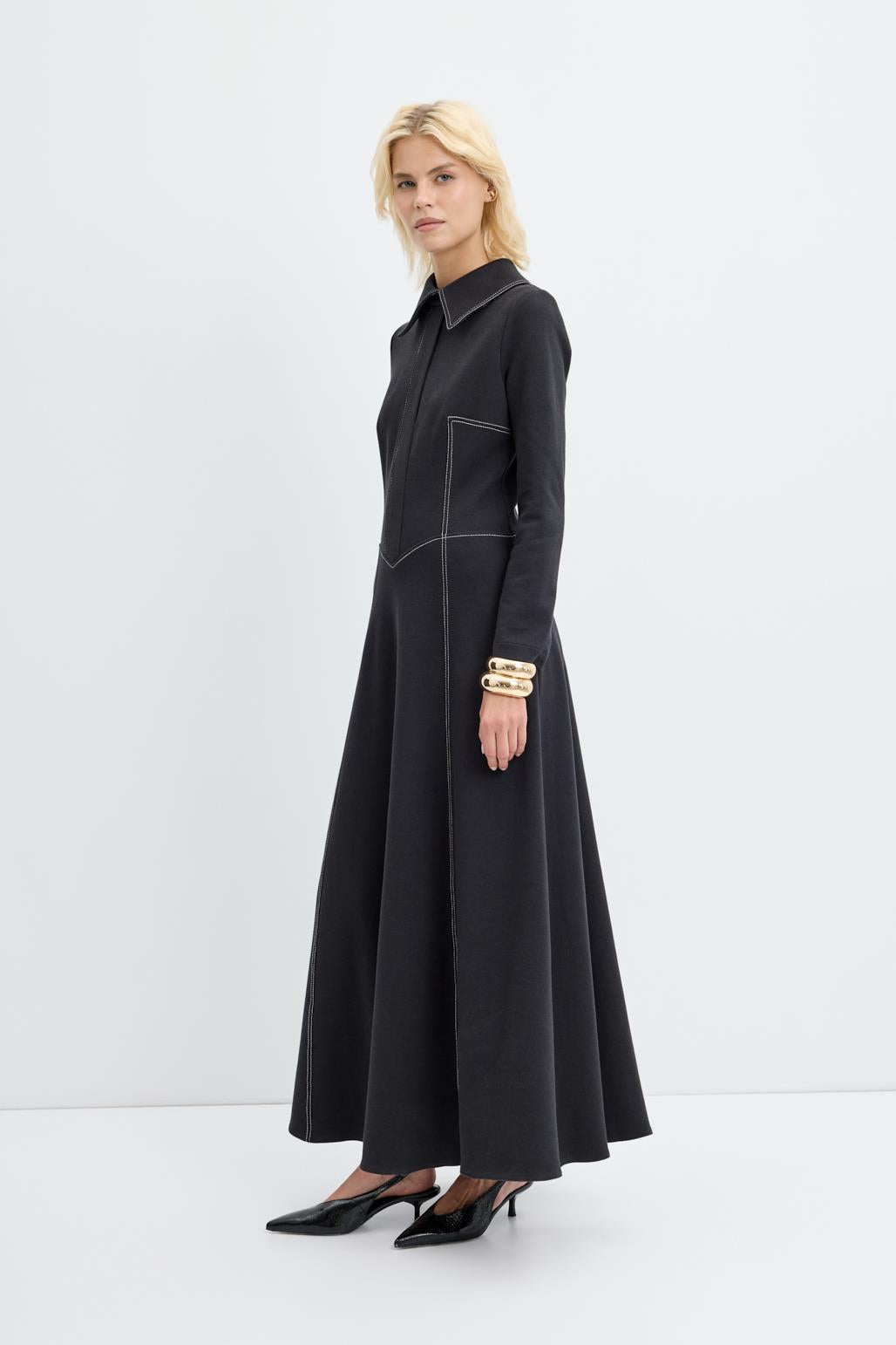 Punto Dikişli Örme Elbise Siyah, double face pamuk kumaşıyla rahat ve kaliteli bir kullanım sunar. Geniş yakası ve ön bedendeki süs pat detayıyla şık bir görünüm kazanırken, arka fermuar kapaması pratiklik sağlar. Kesikli ve kontrast dikişleri modern bir dokunuş katarken, uzun kloş kesimi hareketli ve feminen bir duruş yaratır.