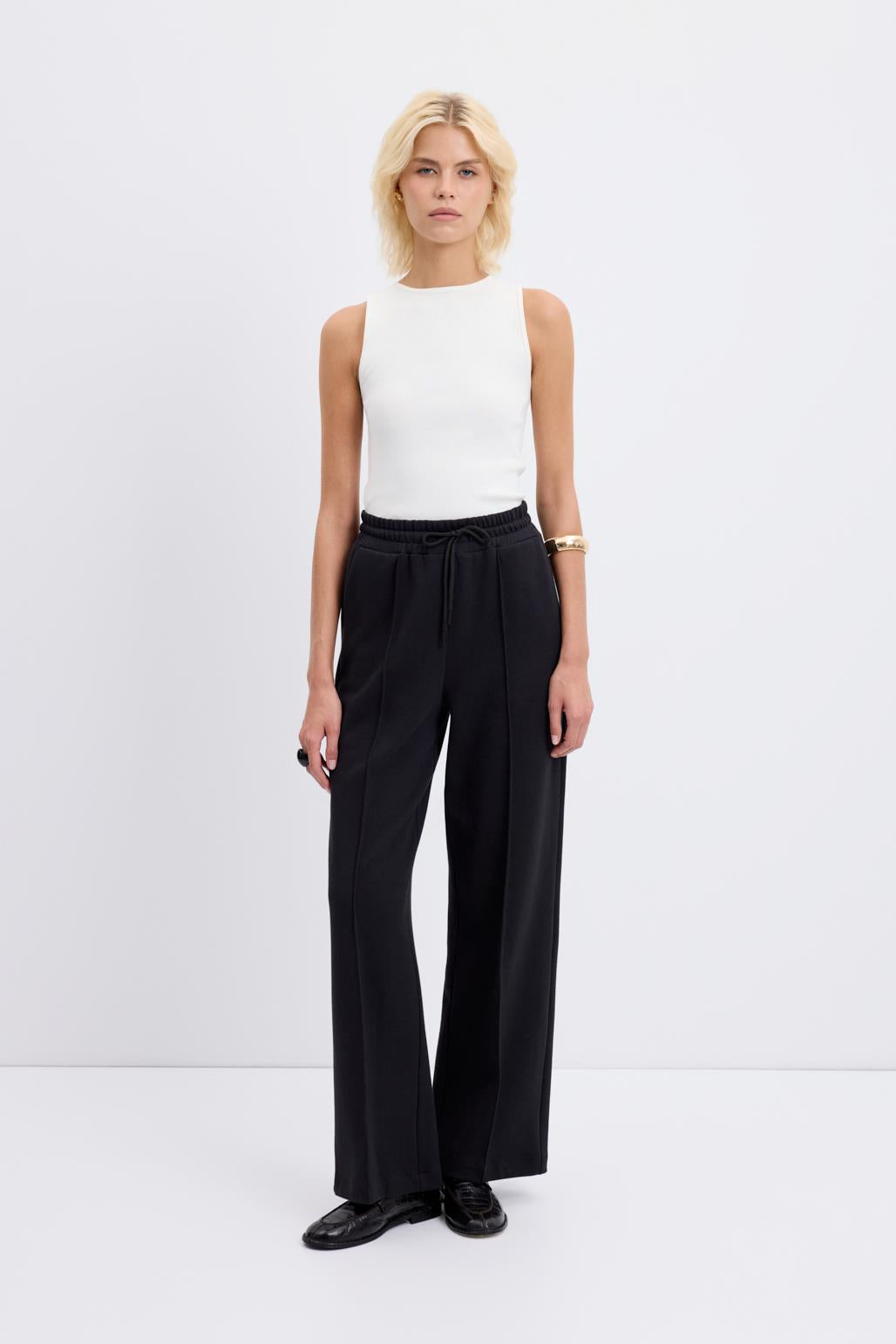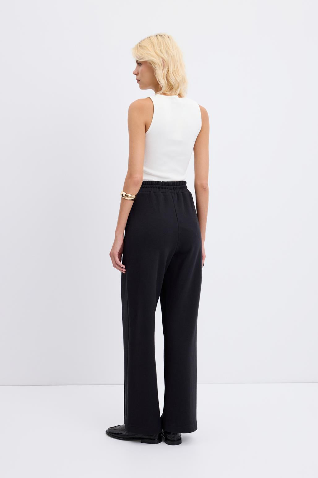 Yüksek Bel Dikiş Detaylı Rahat Kesim Pantolon Siyah, double face pamuk kumaştan üretilmiş konforlu ve şık bir modeldir. Tam tur lastikli yüksek beli ve ayarlanabilir bağcık detayı kişiye özel uyum sağlar. Nervür dikiş detayları pantolona estetik bir dokunuş katarken, rahat kesimi gün boyu hareket özgürlüğü sunar. Hem günlük kullanımda hem şık kombinlerde kolayca tercih edilebilecek, gardırobunuzun vazgeçilmezlerinden biridir.