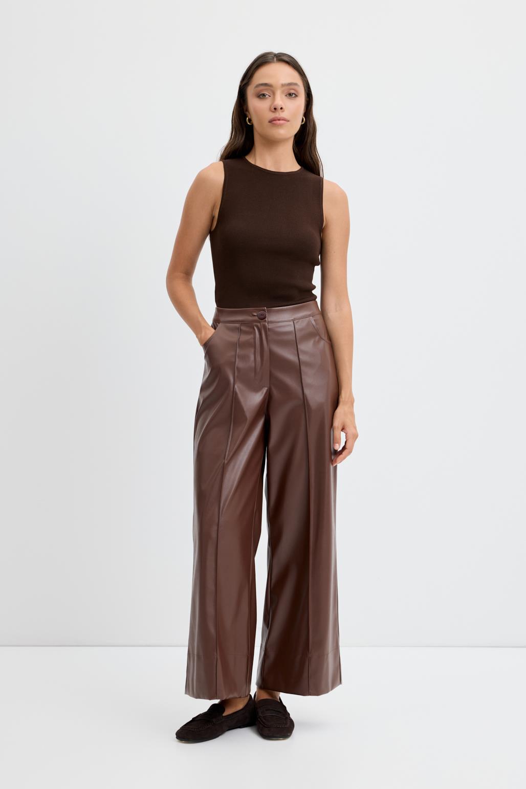 Yüksek Bel Nervür Dikişli Deri Pantolon Kahve
