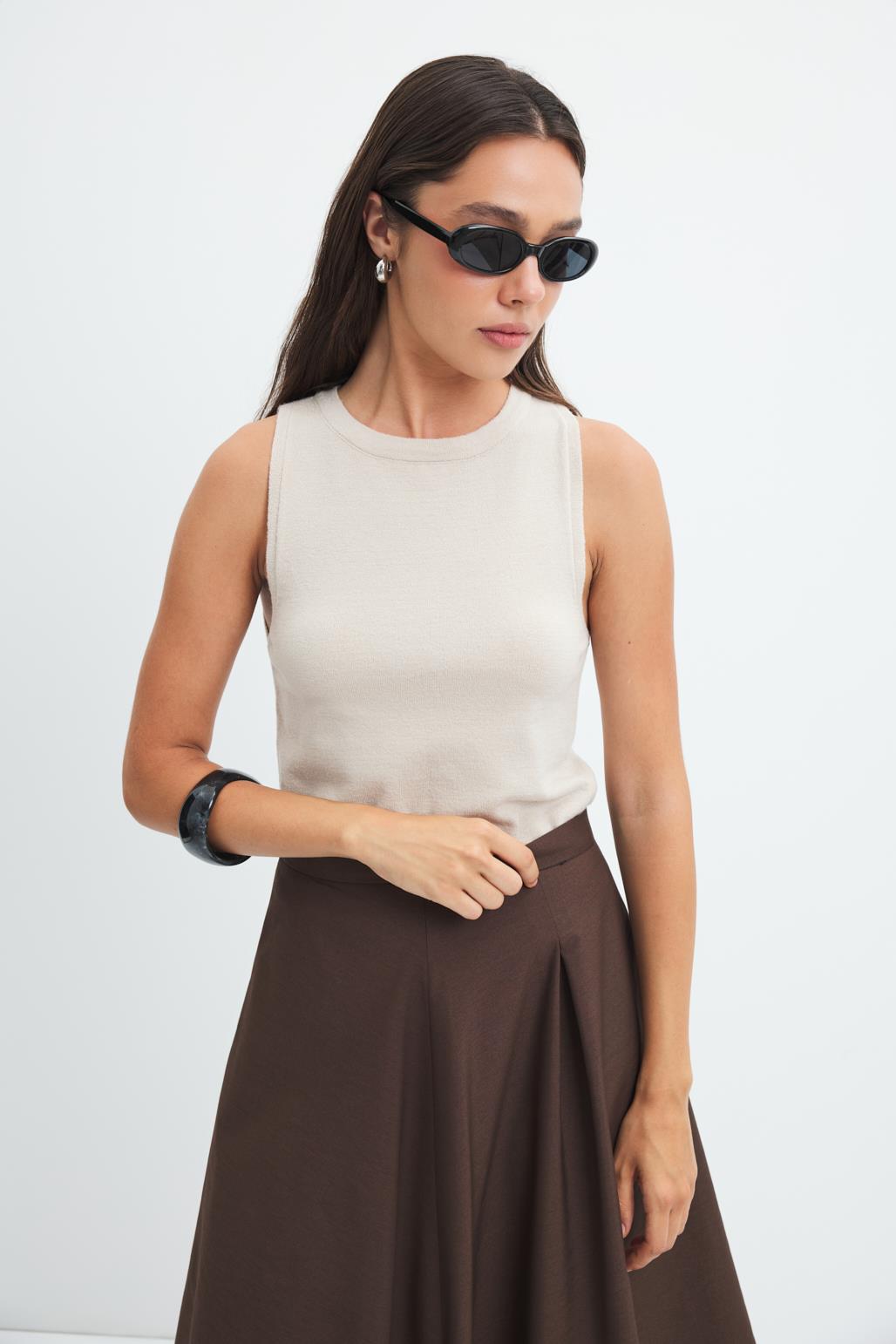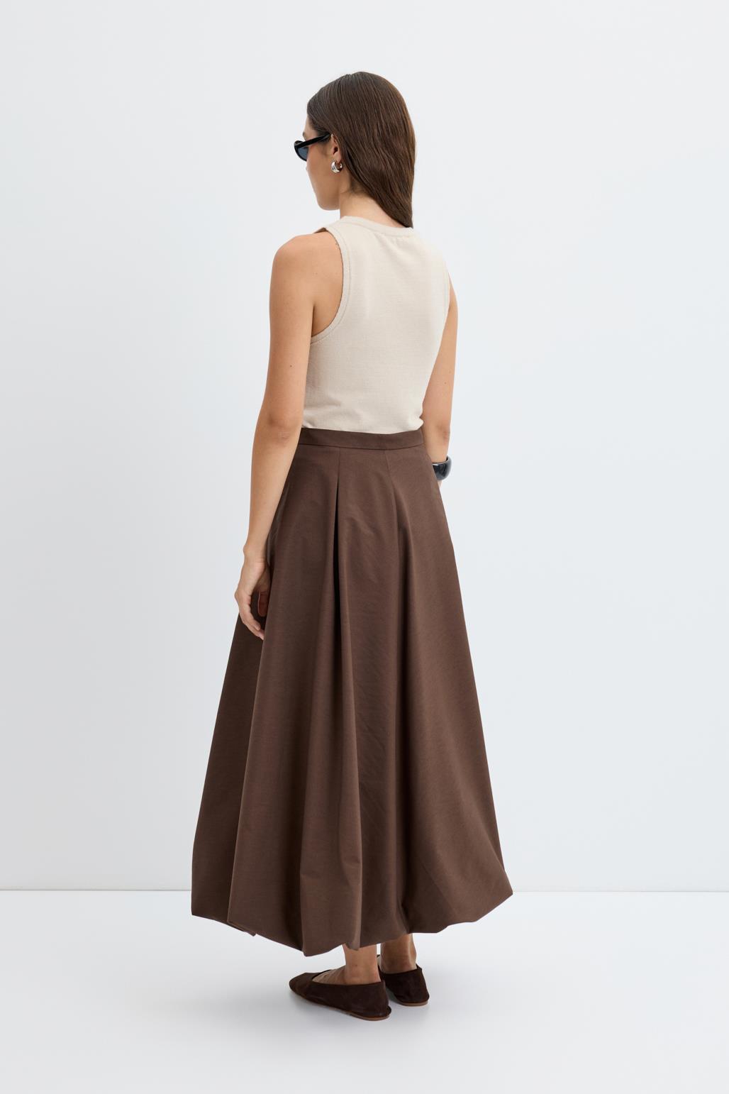 Yüksek Bel Pile Detaylı Balon Etek Kahve